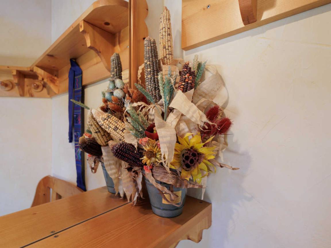Wohnzimmer mit sichtbaren Holzbalken und Mauerwerk, ausgestattet mit Kamin und Doppelschlafsofa, sowie einer Küche mit Geschirrspüler und Mikrowelle.