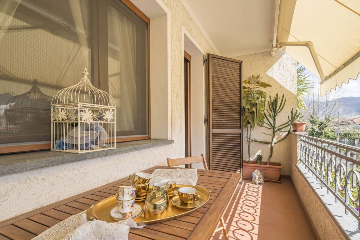 Wohnzimmer: Sofa, Kamin, Esstisch, WiFi Internet, Ausgang auf den Balkon.