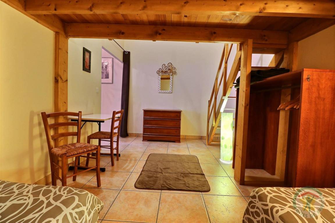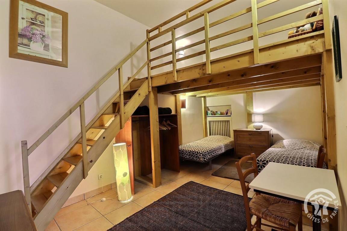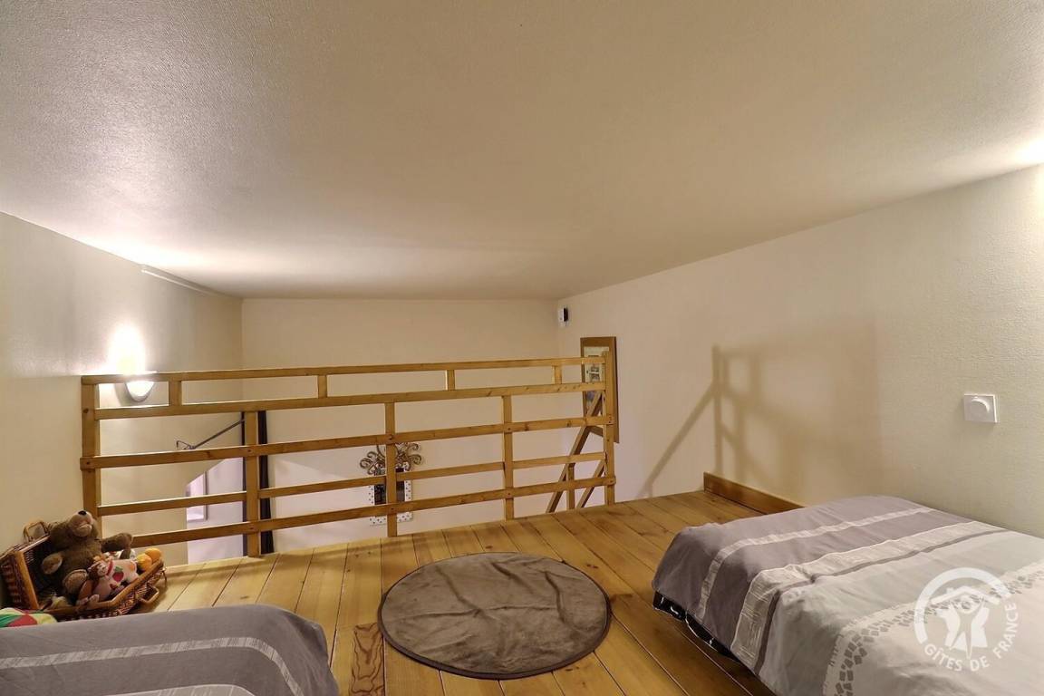 - ein Schlafbereich mit zwei 90 x 190 cm großen Betten (auf Wunsch in ein 180 x 190 cm großes Bett umwandelbar) und ein Zwischengeschoss mit niedriger Decke mit zwei 90 x 190 cm großen Betten