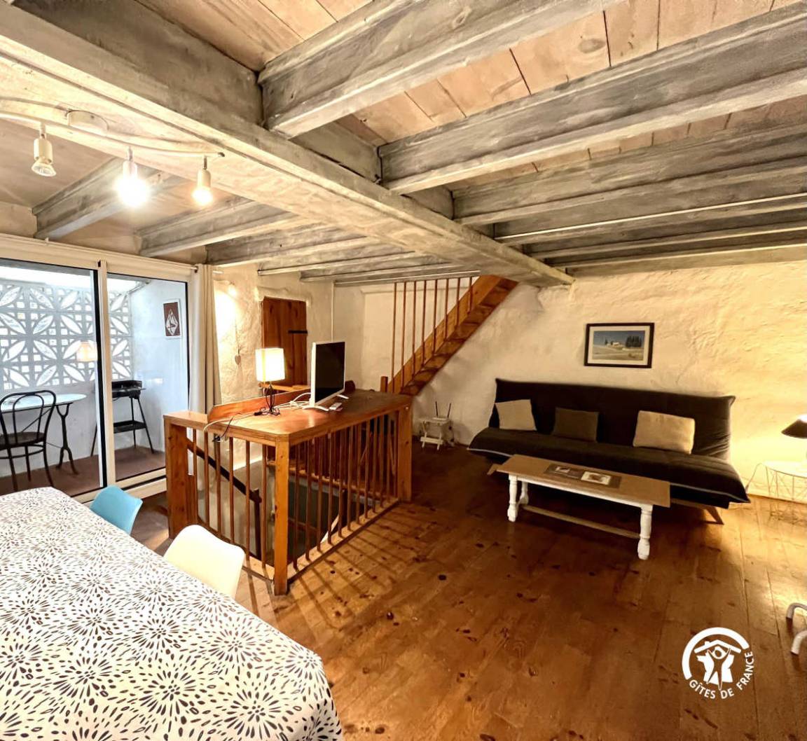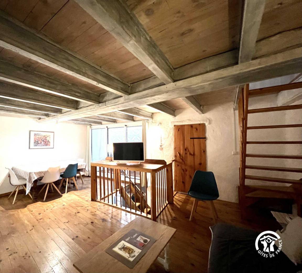 Ferienhaus eingerichtet wie ein großes Loft auf 3 Ebenen: Erdgeschoss, großes Zimmer mit 1 Bett für 2 Personen und 1 Bett 1. SDE - WC. 1 Etage: Küche, Wohnzimmer mit Sofa. Loggia, kleines Zimmer mit 1 Bett 90. Etage 2: große ch 1 Bett 2 Personen mit Blick auf die Terrasse von 10 m ² SDE-2 WC. Zimmerservice-Waschküche mit Waschmaschine. Bibliothek und Gesellschaftsspiele. Zusätzliche Heizung.