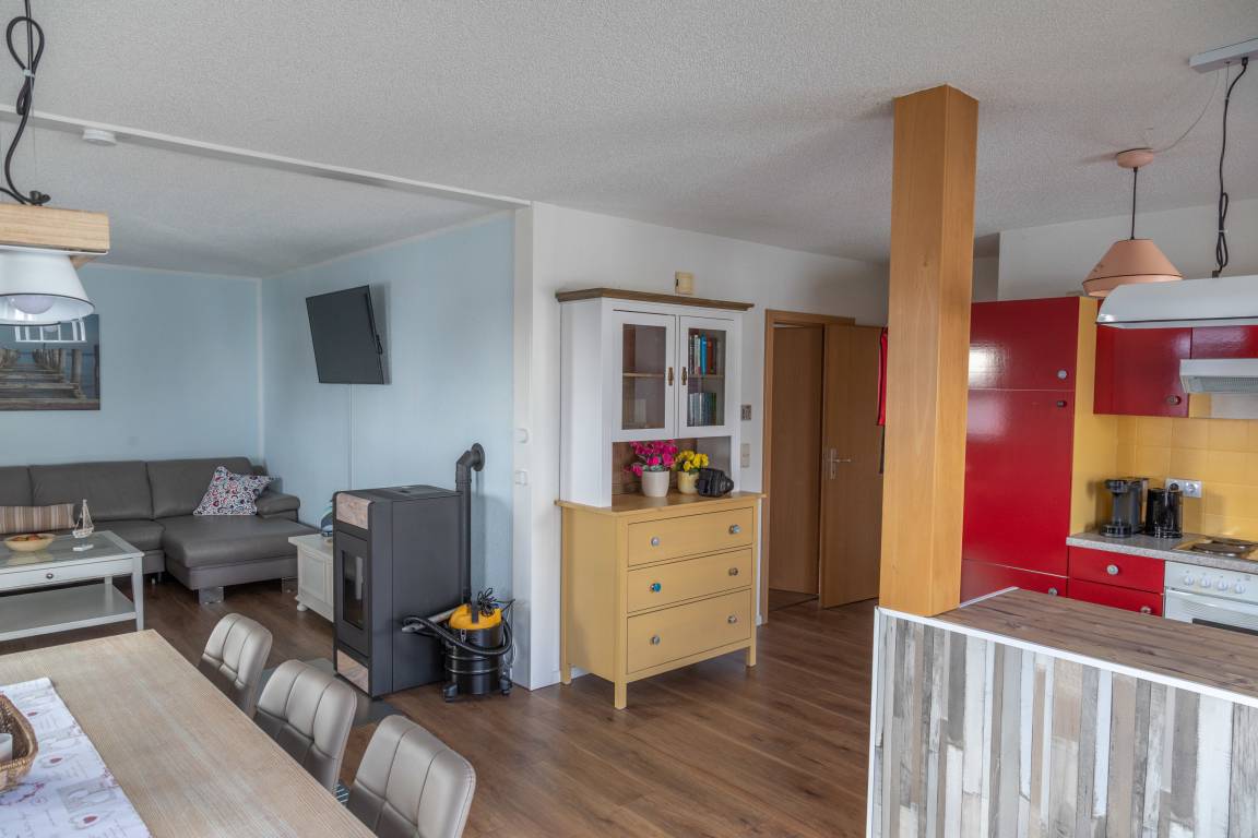 Die Wohnung besteht aus einem Schlafzimmer mit Doppelbett (180 x 200 cm), einem Schlafzimmer mit 2 Einzelbetten (2 x 90 x 200 cm), einem Tageslicht-Bad (Dusche, WC, Waschbecken, Spiegel), einer offene Küche mit Wohn.-Essbereich mit Esstisch/6 Stühle, Kücheninsel, Elektroherd mit 4 Kochplatten, Backofen, Kühlschrank mit Gefrierfach, Spühlmaschine (Tischgerät), Mikrowelle, Eierkocher, Toaster, Wasserkocher, Kaffeemaschine (Senseo/Filtermaschine), Geschirr, Besteck, Töpfe/Pfannen und Vieles mehr. Der offene Wohnbereich verfügt über eine großer Wohnlandschaft, mit Schlafsofa, Couchtisch, Sessel, Flachbildschirm TV, Internet-Radio. Für die Terrasse stehen Gartenstühle, ein Tisch, sowie ein Sonnenschirm zur Verfügung.