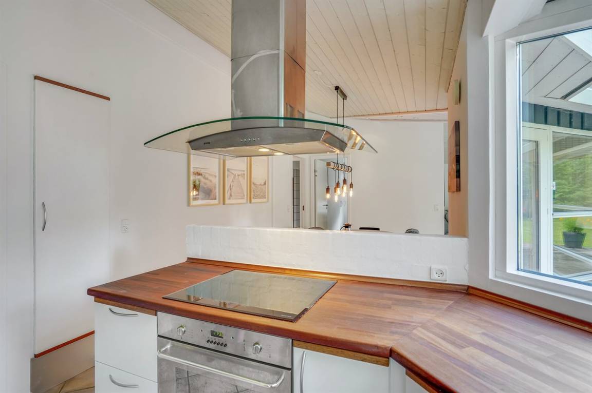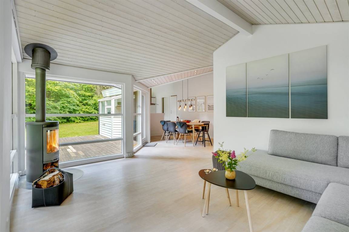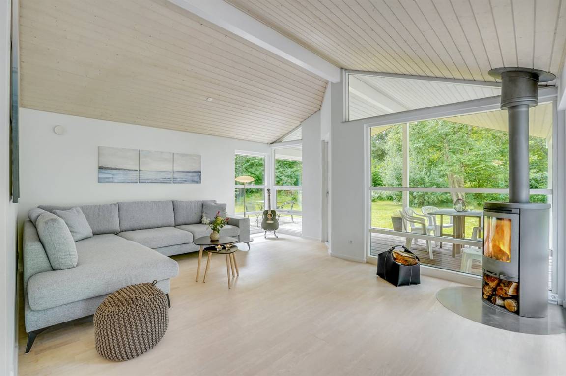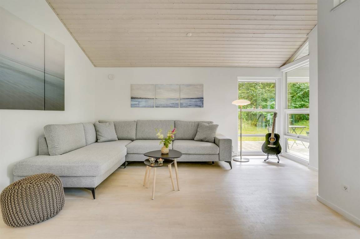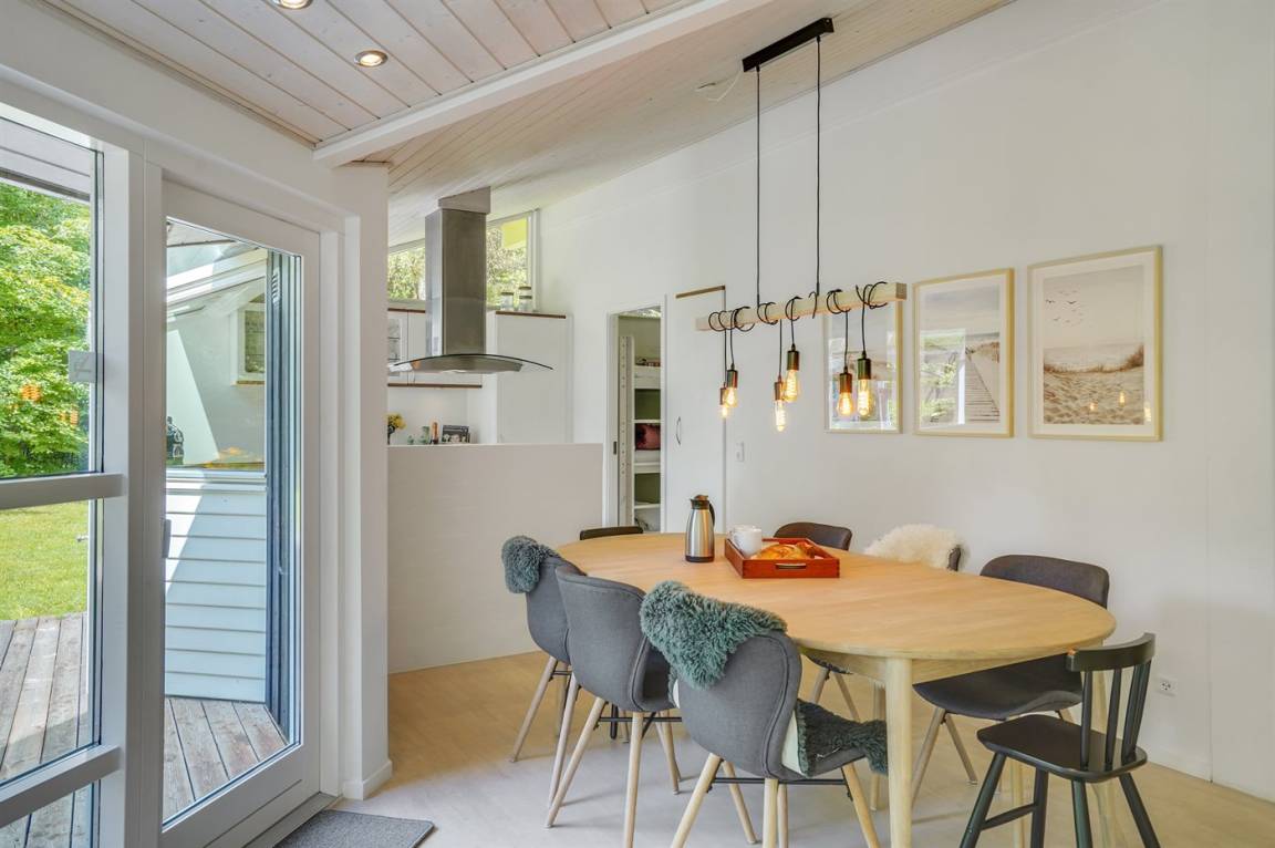 Dieses lichtdurchflutete Ferienhaus mit hohen Decken in allen Räumen bietet den idealen Rahmen für einen perfekten Urlaub! Die Küche, die Essecke und das Wohnzimmer sind in einem offenen Bereich zusammengefasst und bilden dadurch den natürlichen Mittelpunkt für ein gemütliches Beisammensein. Von dort gelangt man auf die große, teilweise überdachte Holzterrasse. Das Haus hat 3 Schlafzimmer – zwei mit Doppelbetten und eines mit einem Etagenbett für drei Personen (in erster Linie für Kinder und Jugendliche geeignet).