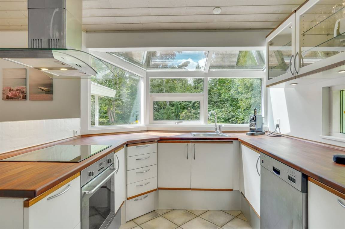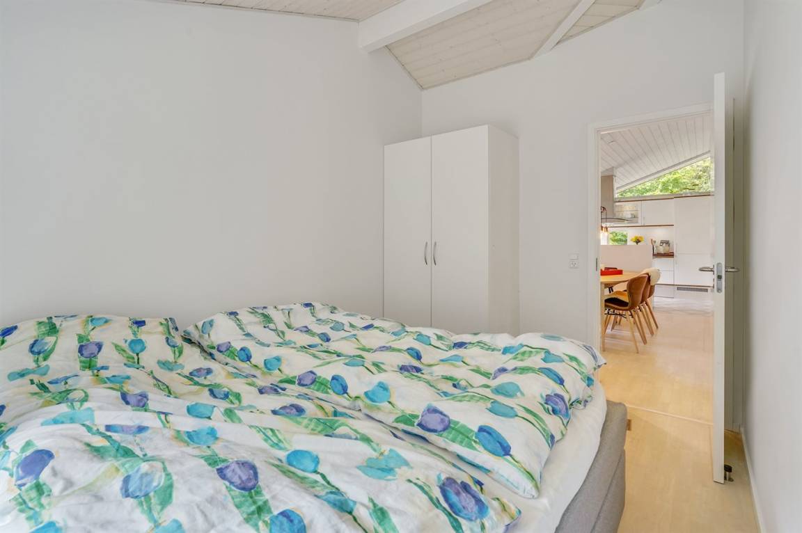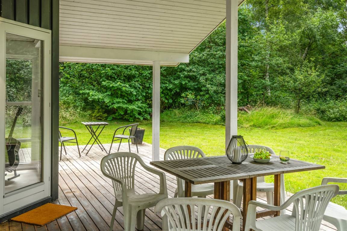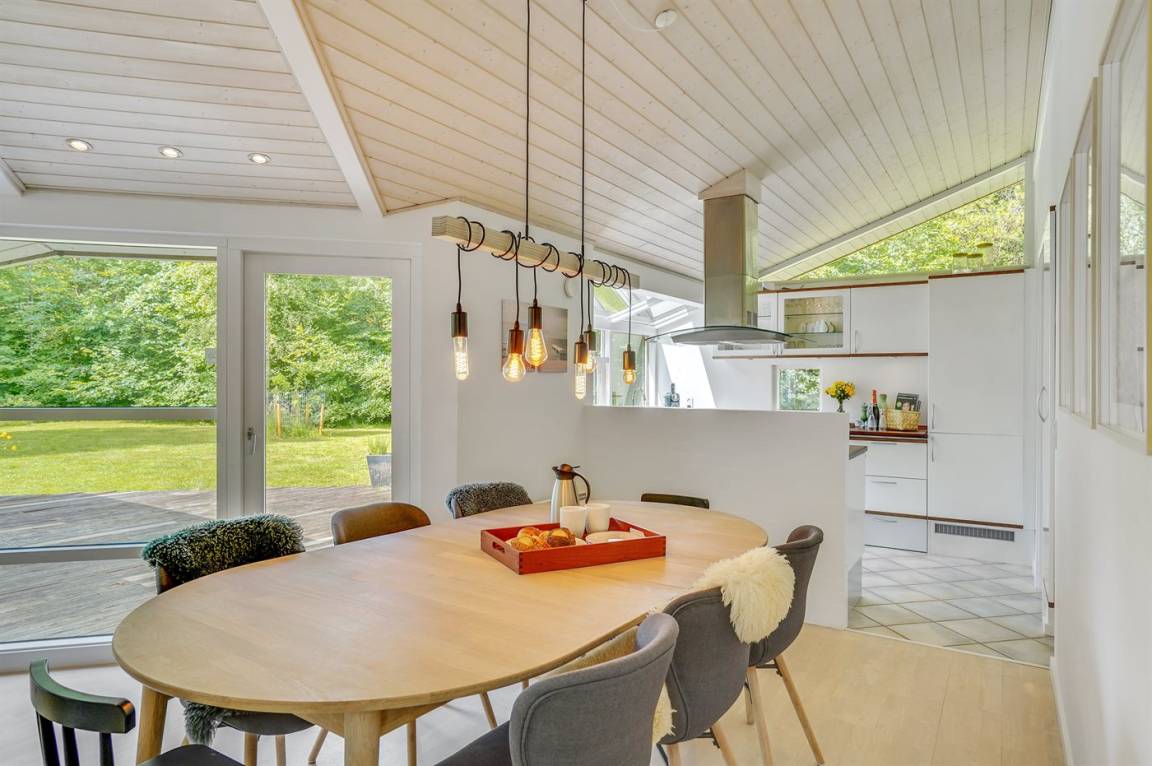 Dieses lichtdurchflutete Ferienhaus mit hohen Decken in allen Räumen bietet den idealen Rahmen für einen perfekten Urlaub! Die Küche, die Essecke und das Wohnzimmer sind in einem offenen Bereich zusammengefasst und bilden dadurch den natürlichen Mittelpunkt für ein gemütliches Beisammensein. Von dort gelangt man auf die große, teilweise überdachte Holzterrasse. Das Haus hat 3 Schlafzimmer – zwei mit Doppelbetten und eines mit einem Etagenbett für drei Personen (in erster Linie für Kinder und Jugendliche geeignet).