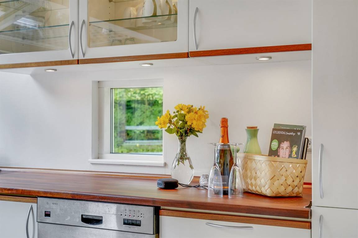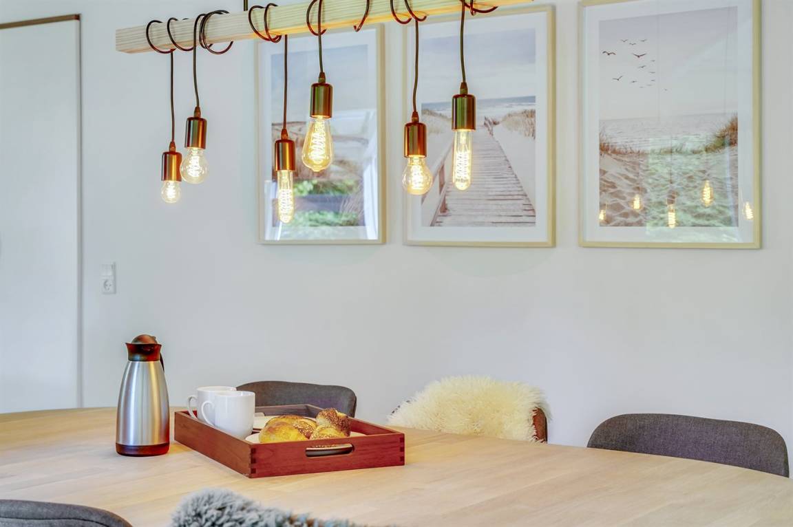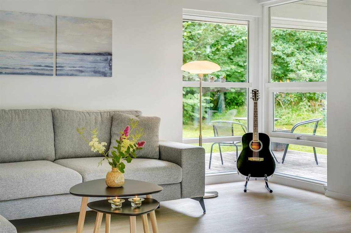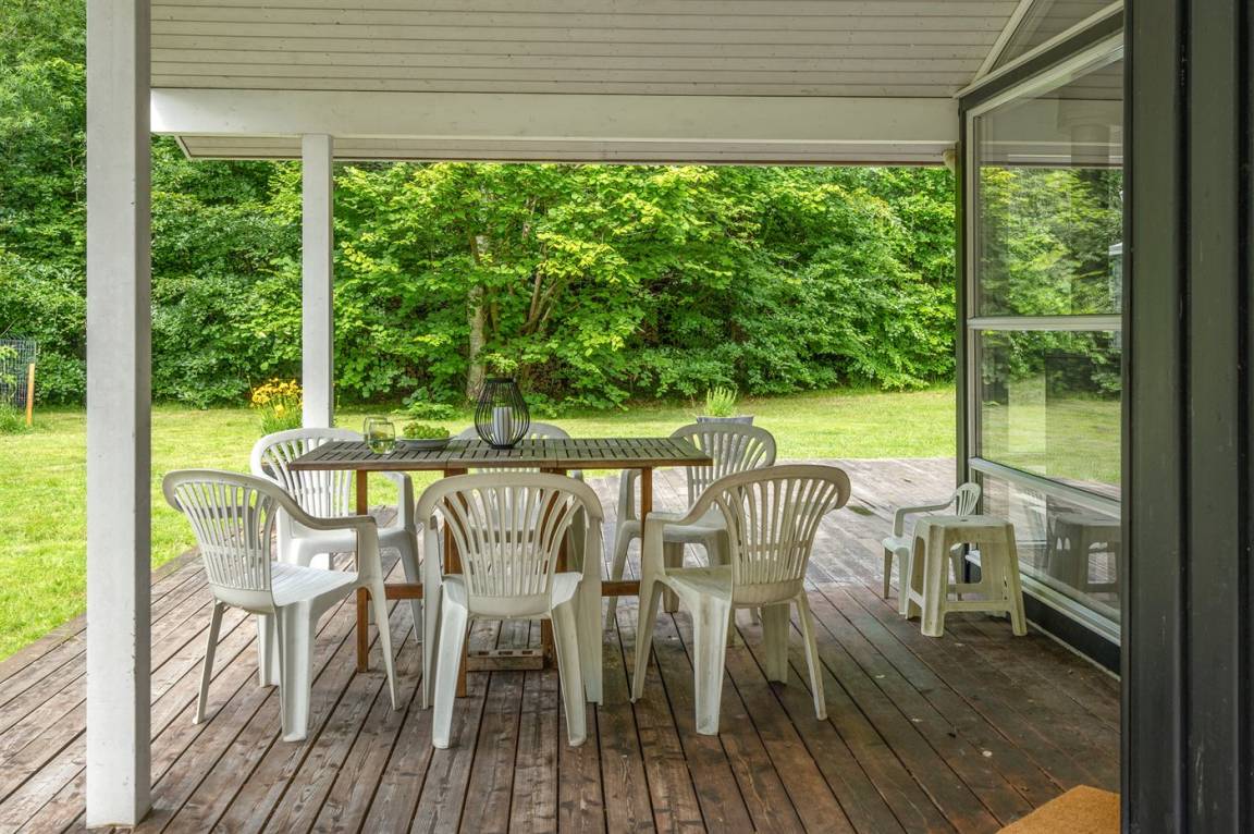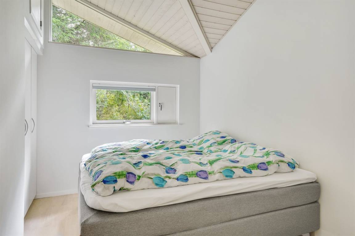Dieses lichtdurchflutete Ferienhaus mit hohen Decken in allen Räumen bietet den idealen Rahmen für einen perfekten Urlaub! Die Küche, die Essecke und das Wohnzimmer sind in einem offenen Bereich zusammengefasst und bilden dadurch den natürlichen Mittelpunkt für ein gemütliches Beisammensein. Von dort gelangt man auf die große, teilweise überdachte Holzterrasse. Das Haus hat 3 Schlafzimmer – zwei mit Doppelbetten und eines mit einem Etagenbett für drei Personen (in erster Linie für Kinder und Jugendliche geeignet).