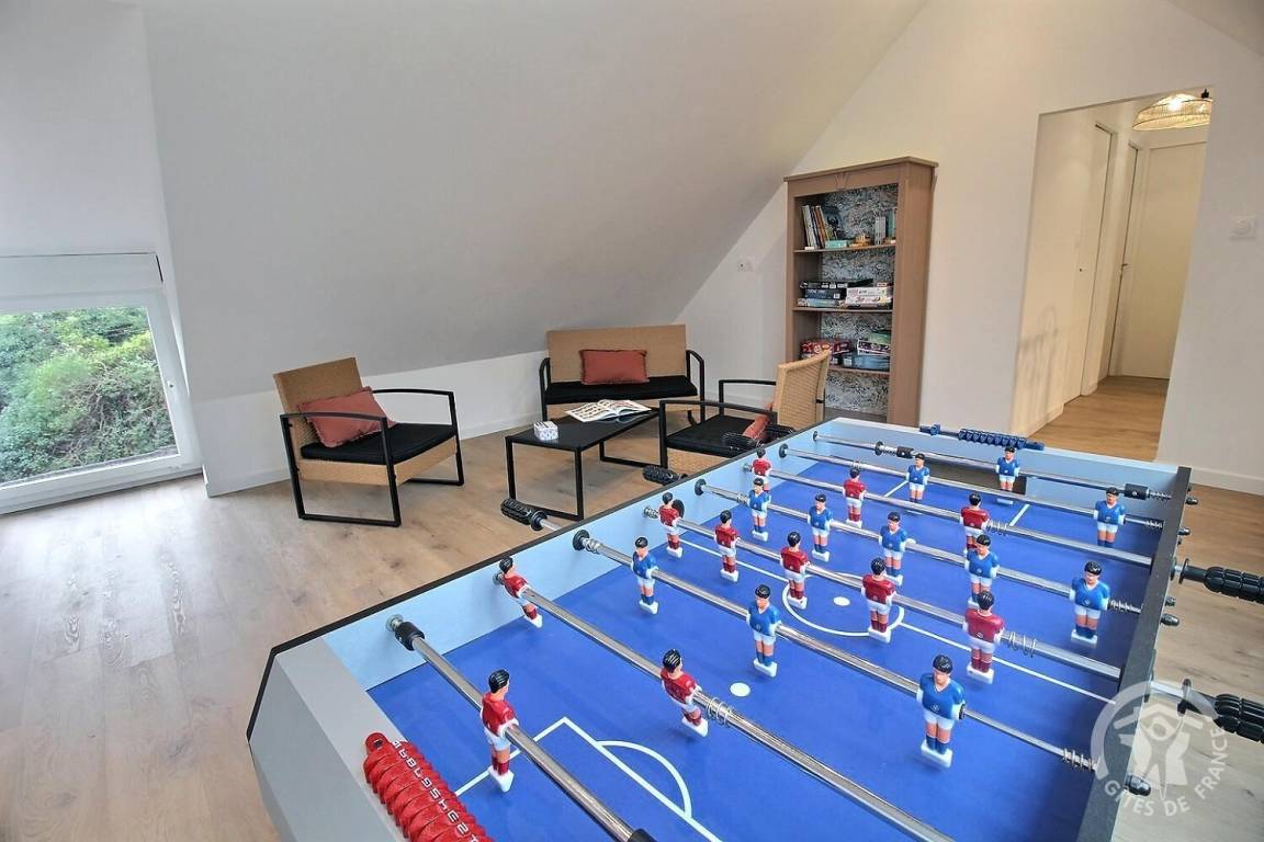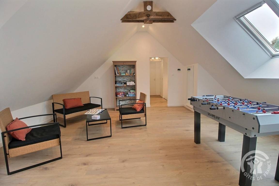 - Obergeschoss: ein Spielbereich im Zwischengeschoss, ein Badezimmer mit Dusche, eine Toilette, zwei Schlafzimmer (1 Bett 140 x 190 und 2 Betten 90 x 190), ein drittes Schlafzimmer (1 Bett 140 x 190) sowie ein eigenes Badezimmer mit Badewanne.