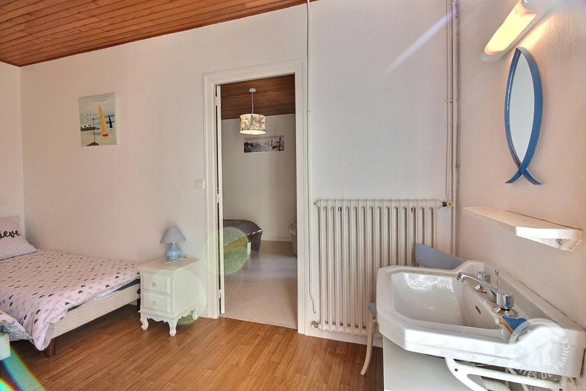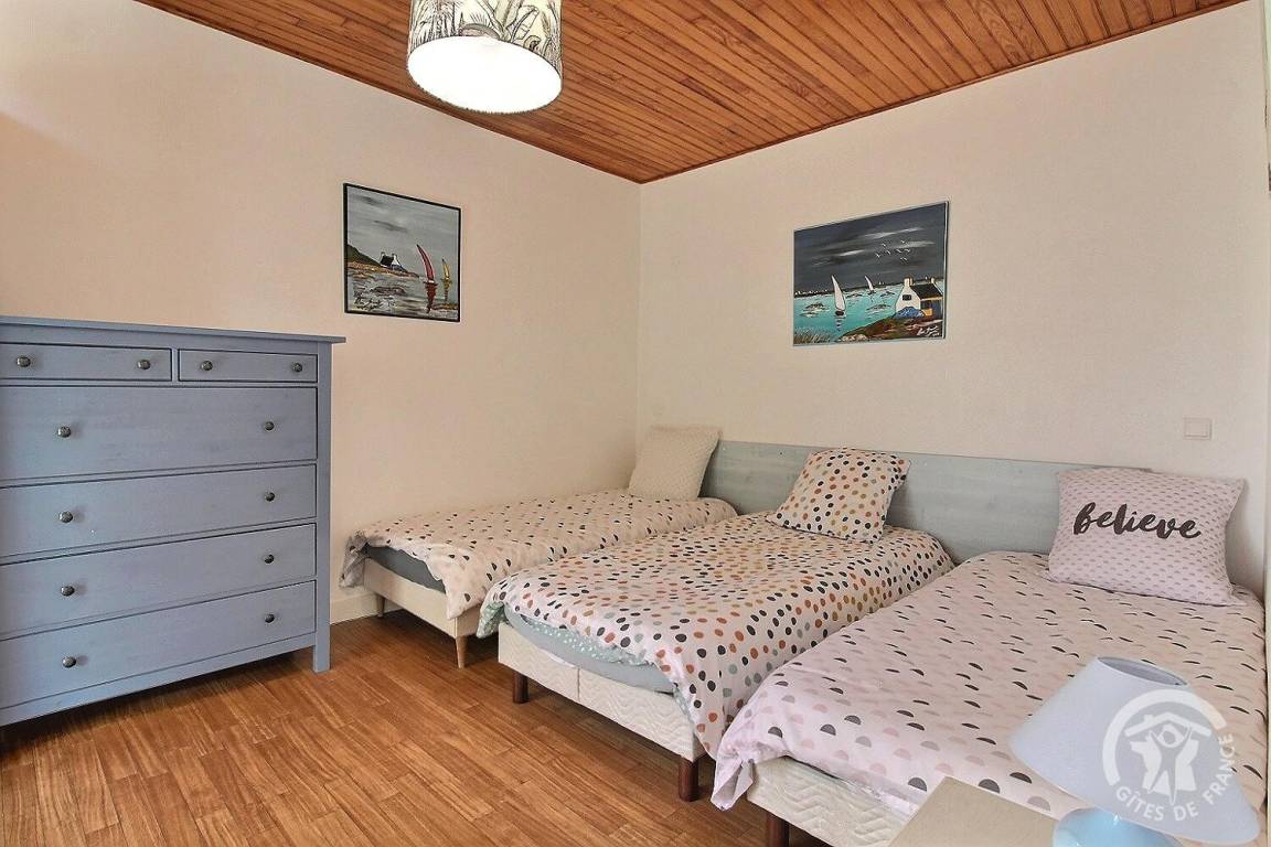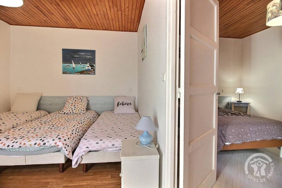 - ein Schlafzimmer mit 2 Einzelbetten. 90x190 (Les Bigorneaux) mit Zugang zu einem weiteren Schlafzimmer mit 1 Doppelbett. 140x190 (Delfine),