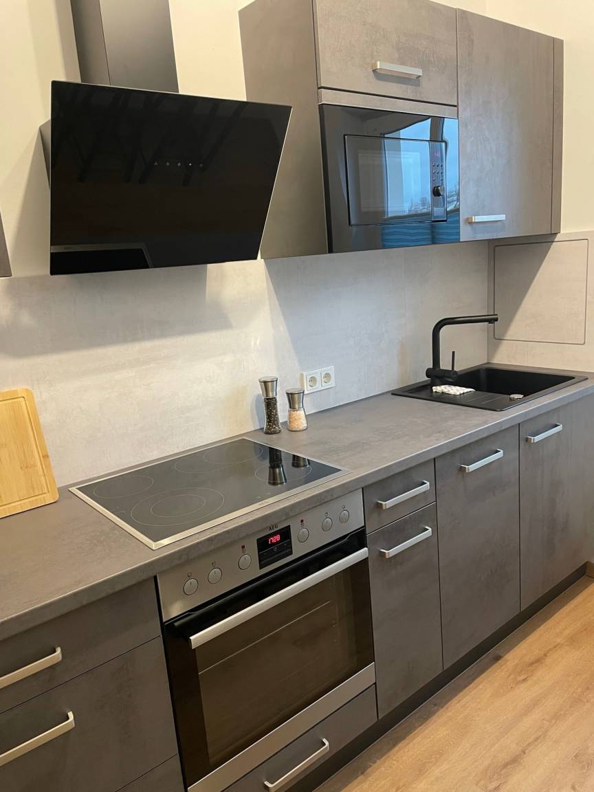 Sie verfügt über eine voll ausgestattete Küche mit Bartisch und zwei Hockern; Flachbild -Sat TV mit großem Esstisch und ausziehbarer Couch im Wohnzimmer; Doppelbett mit Bettwäsche im Schlafzimmer sowie ein eigenes Bad mit Glasdusche, Badewanne, Haartrockner und Handtüchern. Ein großer Kleiderschrank im Flur bietet genügend Stauraum. Zwei Räume verfügen über Außenrollläden. Im Badezimmer befinden sich zwei Doppelrollos an den dreifach-verglasten Fenstern und das Schlafzimmer ist ausgestattet mit einem Außenrollladen am Fenster und zwei Verdunklungsvorhängen an der Balkontür.