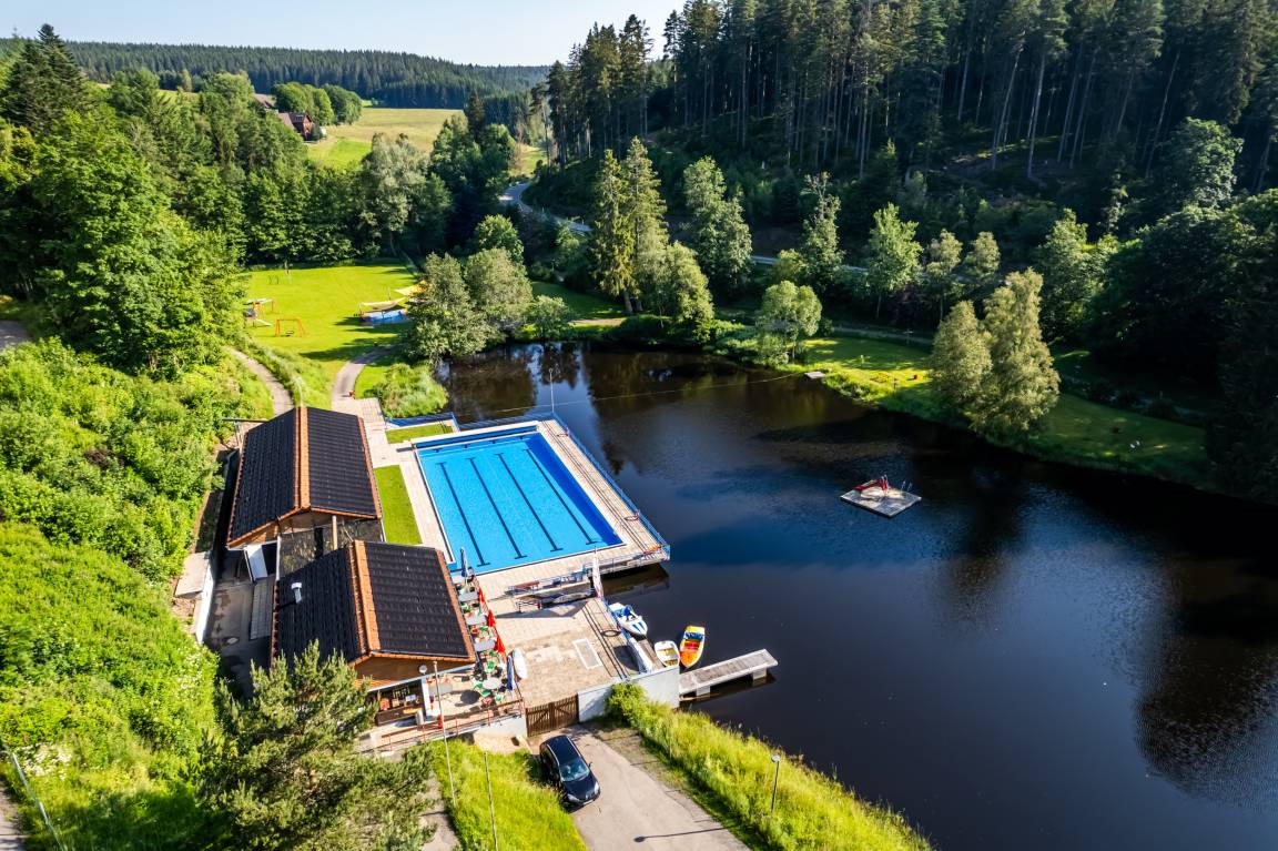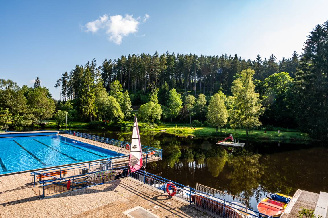 Nur 500m entfernt von der Unterkunft liegt das beheizte Freibad mit Badesee. Die großezügige Liegewiese und das Floß in der Seemitte laden zum Ausruhen und Sonnenbaden ein. Der See kann auch mit Ruderbooten oder über ein 3 Meter-Sprungbrett erkundet werden.
