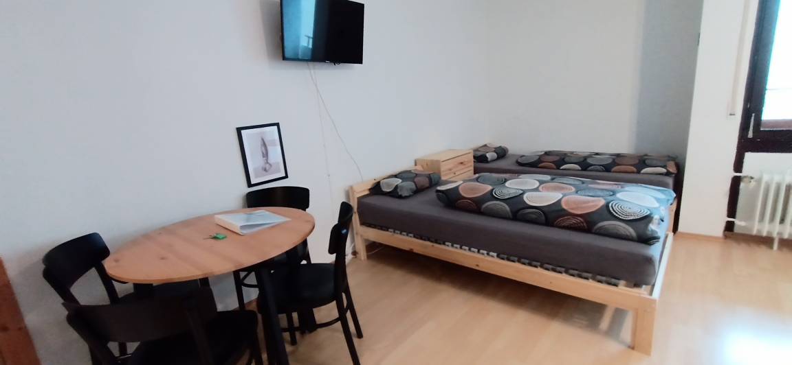 Die Wohnung befindet sich im 2. OG in einem Wohnblock am Ende einer Straße - Sackgasse. Von hier aus erreichen Sie viele Orte bequem in wenigen Autominuten. Zur Messe und Flughafen Friedrichshafen sind es nur 10 Autominuten, sowie Markdorf, Meckenbeuren und Friedrichshafen. Vor dem Haus befindet sich ein großer Parkplatz. Im Keller haben Sie die Möglichkeit Fahrräder unterzustellen. Die Wohnung verfügt über einen kombinierten Wohn-Schlafraum mit Balkon und ausgestattet mit zwei Einzelbetten, die zum Doppelbett gestellt werden können.