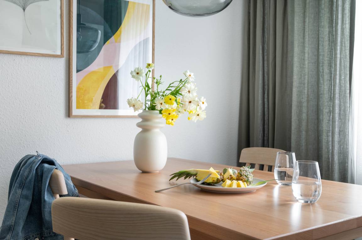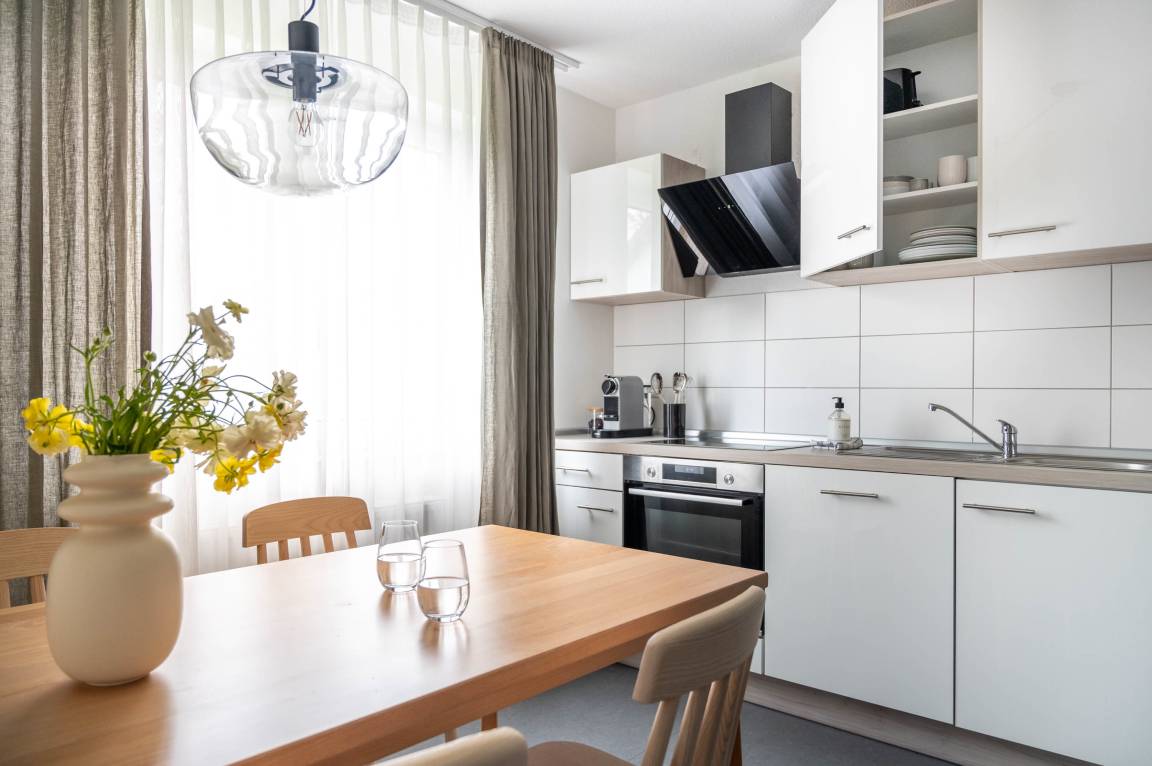 Die voll ausgestattete Küche bietet Ihnen die Möglichkeit, Ihre Mahlzeiten selbst zuzubereiten. Der Herd, Backofen und Kühlschrank stehen Ihnen zur Verfügung, während eine Kaffeemaschine, ein Toaster und eine Spülmaschine den Komfort erhöhen. Der praktische Esstisch eignet sich hervorragend für gemeinsame Mahlzeiten oder als Arbeitsplatz.