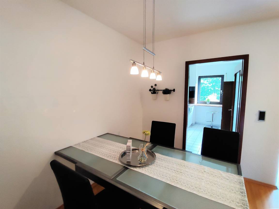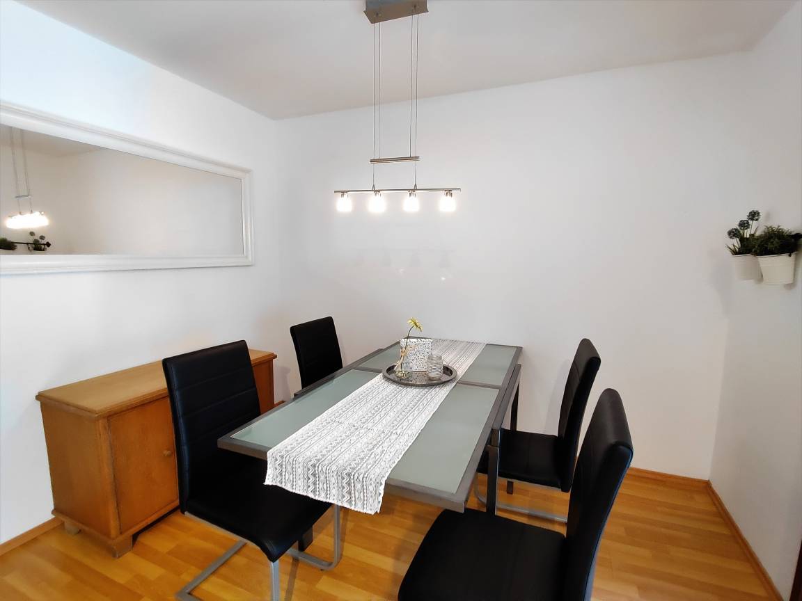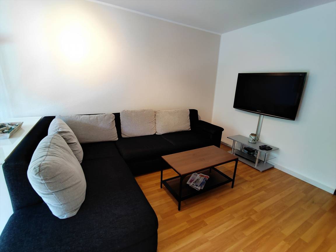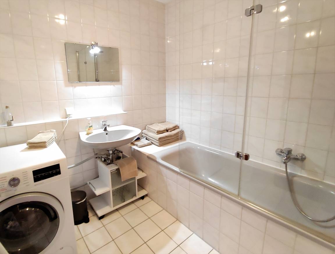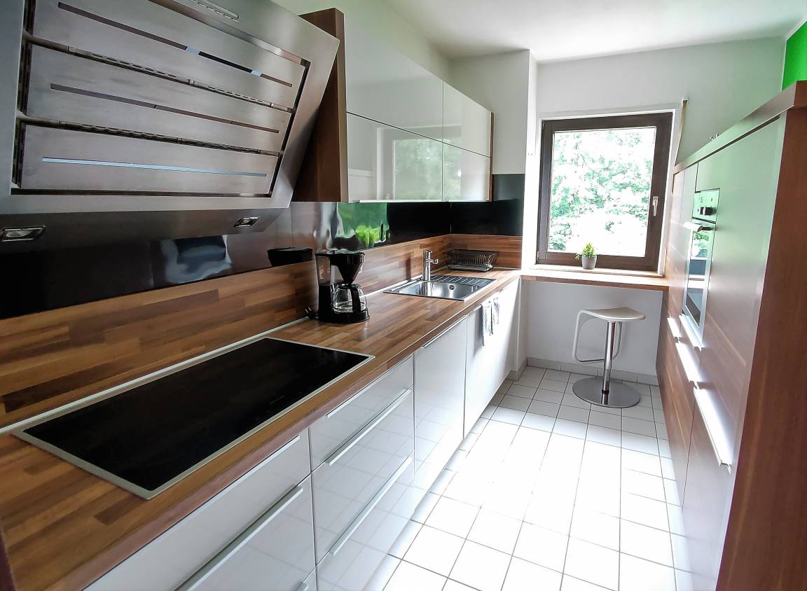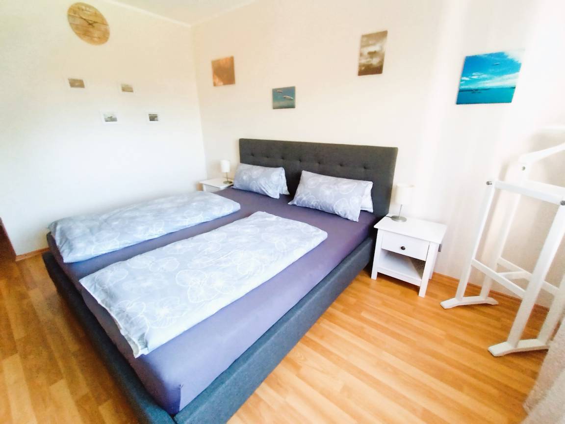 Die Drei-Zimmer-Ferienwohnung verfügt über einen großen Wohn-Essraum mit Balkon, eine topmoderne separate Küche mit Spülmaschine und Backofen sowie Kühl-Gefrierkombination, ein Badezimmer mit Badewanne und Wasch-Trockenautomat, ein separates WC, sowie ein Schlafzimmer mit französischem Bett (140 cm) und ein Schlafzimmer mit Doppelbett (180 cm). In beiden Schlafzimmern ist Platz für ein Kinderreisebett für ein Kind 0 - 3 Jahre.