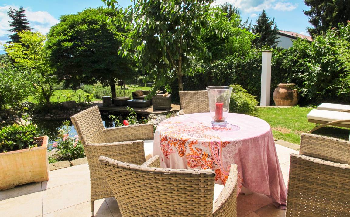 Schöne, lichtdurchflutete, hochwertig ausgestattete Ferienwohnung mit herrlichem Blick auf die Schweizer Berge. Der neu angelegte Garten mit mehreren Terrassen, Sitzplätzen, Liegewiesen sowie großem Teich mit Wasserfall lädt zum Verweilen, Entspannen und Grillen ein.