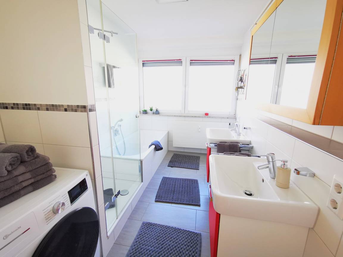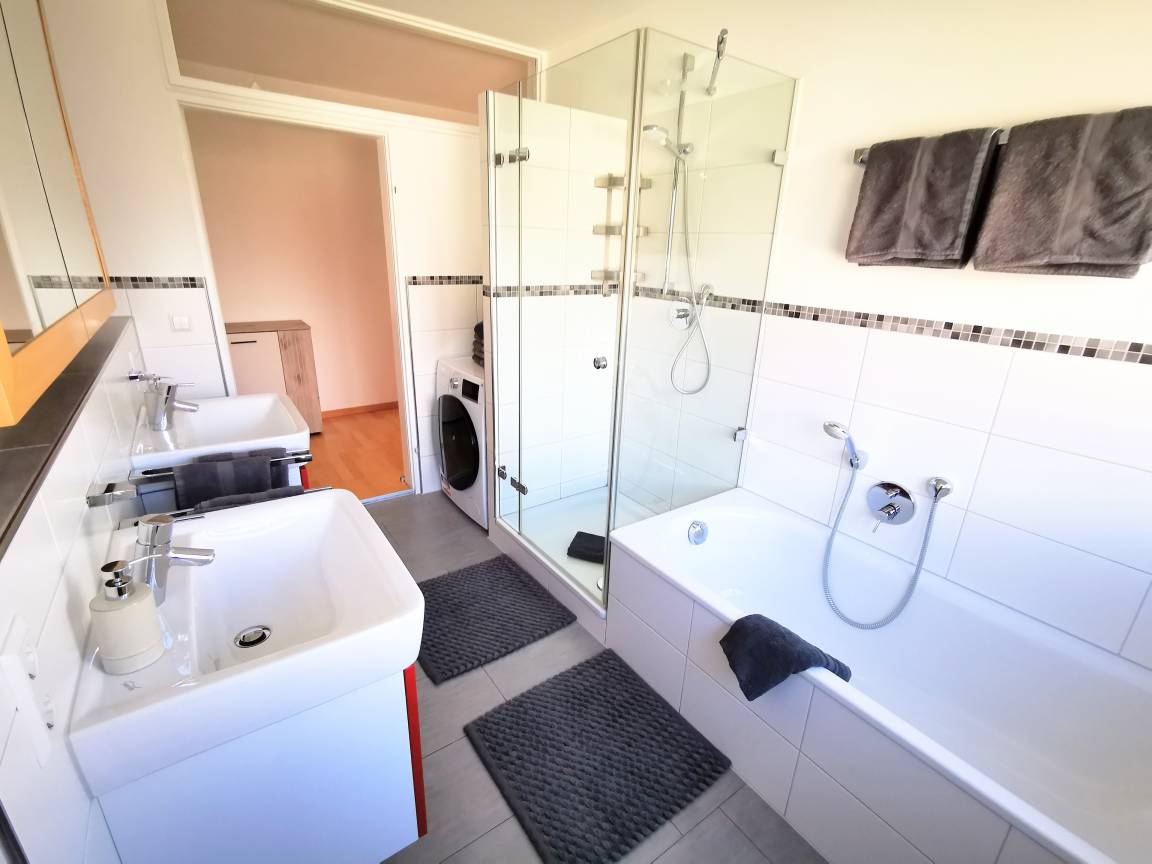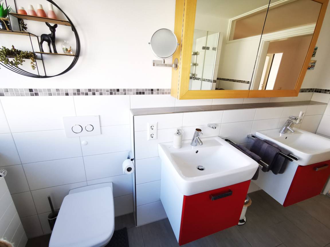 Die Wohnung ist komplett neu und nach dem Standard KfW-70. Sie besteht aus 3 geräumigen Schlafzimmern und ist insgesamt 140 m² groß. Die gemütlichen Doppelbetten laden nach einem ereignisreichen Tag zum Relaxen ein. Im modernen und hellen Bad können Sie in der großen Badewanne entspannen. Zur Ausstattung der modernen Einbauküche gehören: Cerankochfeld, Backofen, Mikrowelle, Spülmaschine, Filterkaffeemaschine und Kühlschrank mit Gefrierfach. Im Wohnbereich ist ein Fernseher vorhanden. Außerdem gibt es zwei Kinderhochstühle (Hauk), 2 Babybetten. Das Badezimmer ist mit Dusche, Badewanne und Doppelwaschbecken sowie Waschmaschine ausgestattet.
