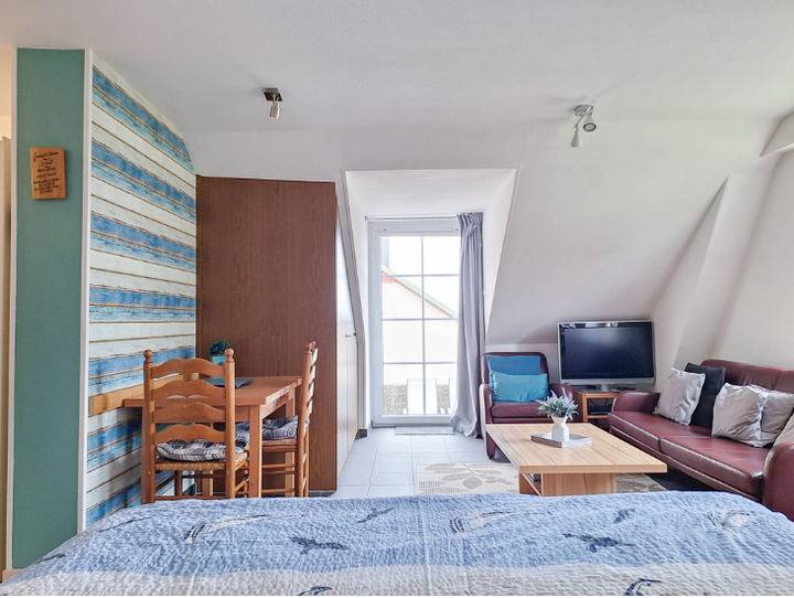 Die Ferienwohnung Seestern hat einen Wohn- und Schlafbereich mit Essecke, Sofa und Sessel, einem erhöhten Doppelbett 160 x 200 cm, Fernseher, DVD-Player, Radio, SAT-TV.