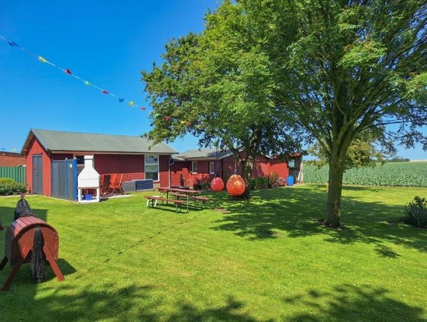 Auf dem riesigen Grundstück mit Liegewiese und vielen Sitzmöglichkeiten befindet sich auch eine zusätzliche Grillterrasse mit Grill.