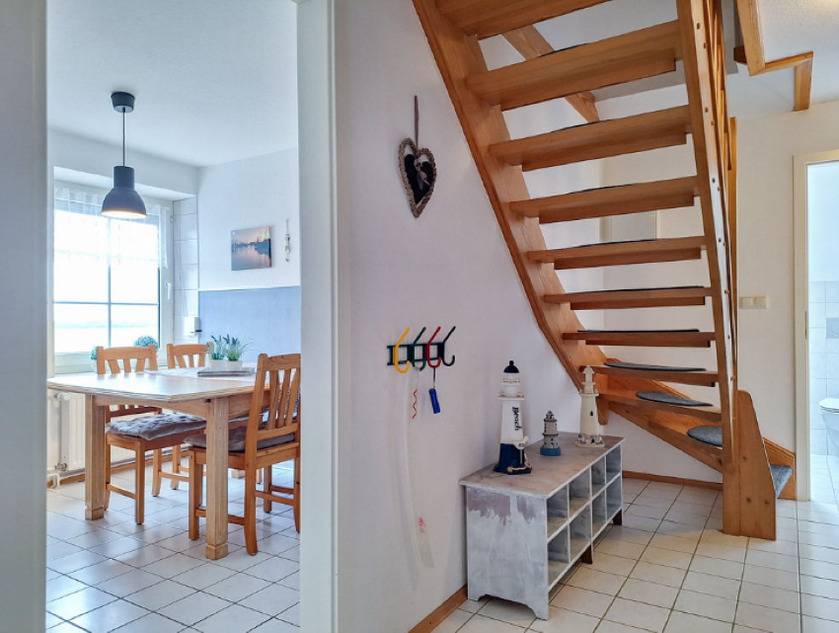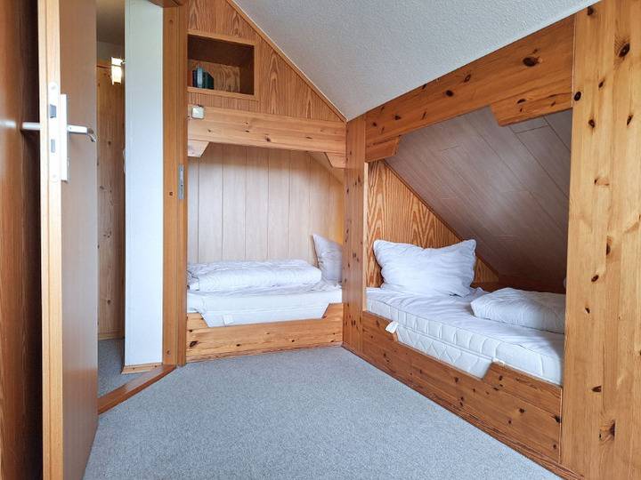 Über eine Treppe erreicht man das Dachgeschoß mit 4 Einzelbetten 90 x 190 cm in Alkoven.