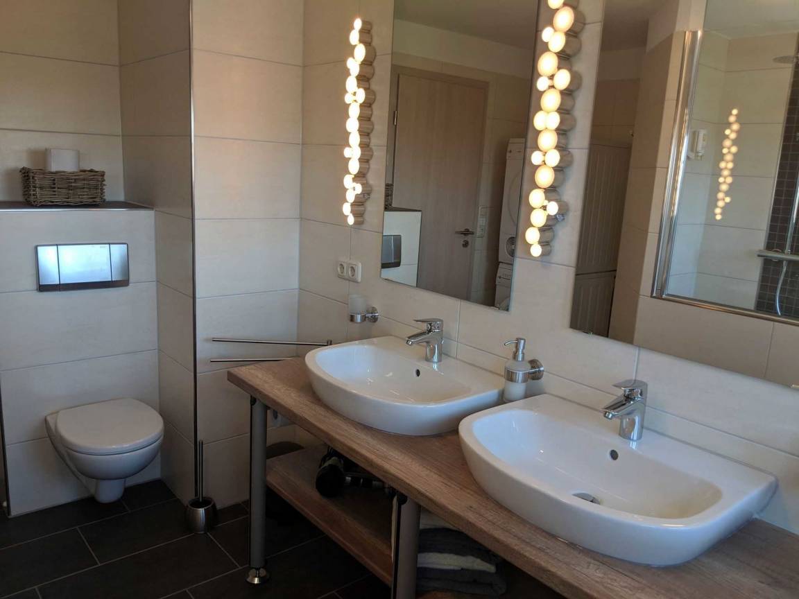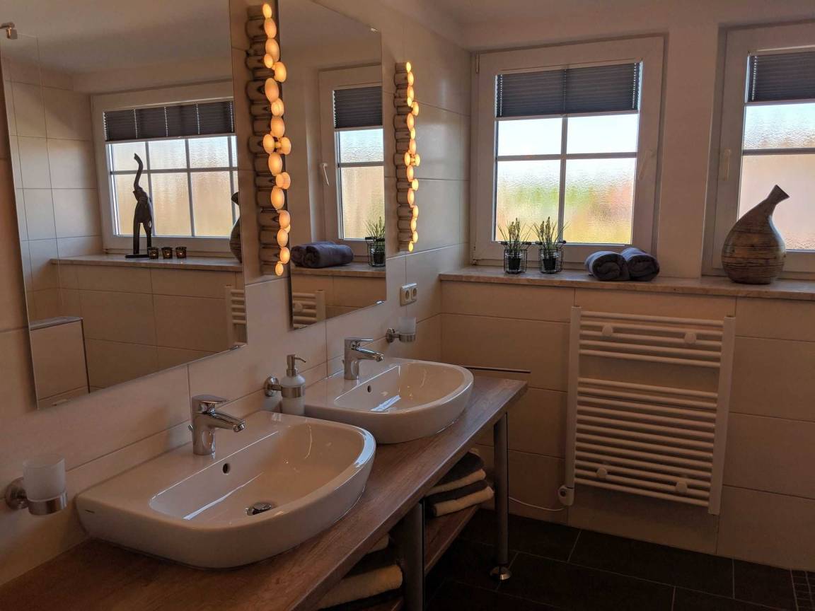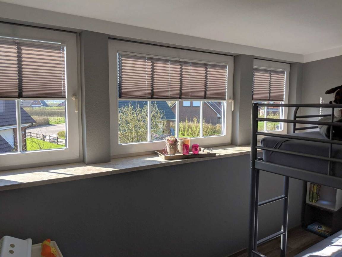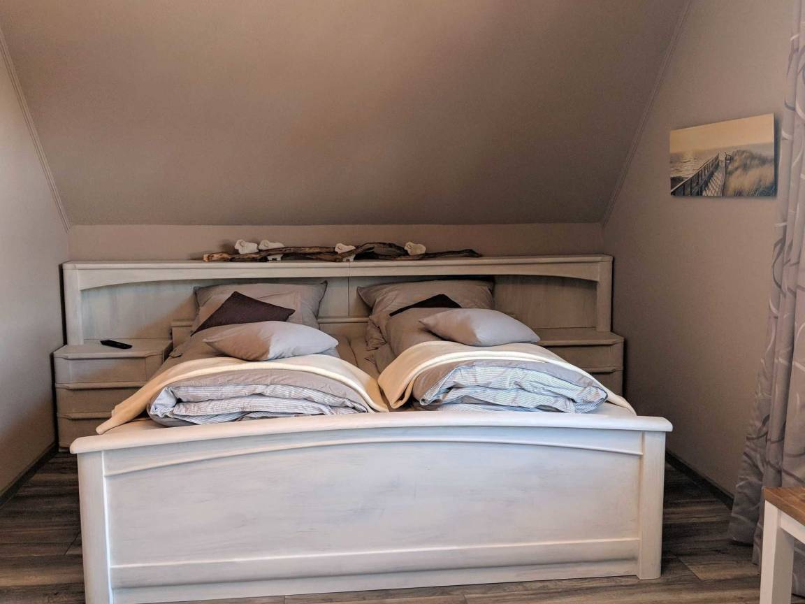 Das Ferienhaus bietet bis zu 6 Personen in drei Schlafzimmern Platz. Zwei Schlafzimmer sind mit hochwertigen Doppelbetten ausgestattet. Im dritten Schlafzimmer befindet sich ein Etagenbett in den Maßen 90x200cm. Ein Kinderreisebett sowie ein Hochstuhl steht für die kleinsten Gäste kostenfrei zur Verfügung. Im kernsanierten Badezimmer erwartet Sie eine geräumige Dusche und genügend Ablagemöglichkeiten für Ihre Kosmetikartikel. Ein weiteres WC im Erdgeschoss sowie die bereitgestellte Wachmaschine und ein Wäschetrockner runden Ihren Urlaubskomfort ab. Im gesamten Haus befinden sich elektrische Außenrolladen an den Fenstern.