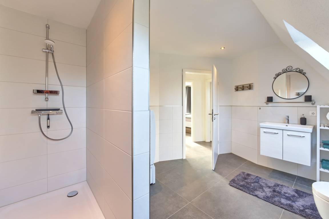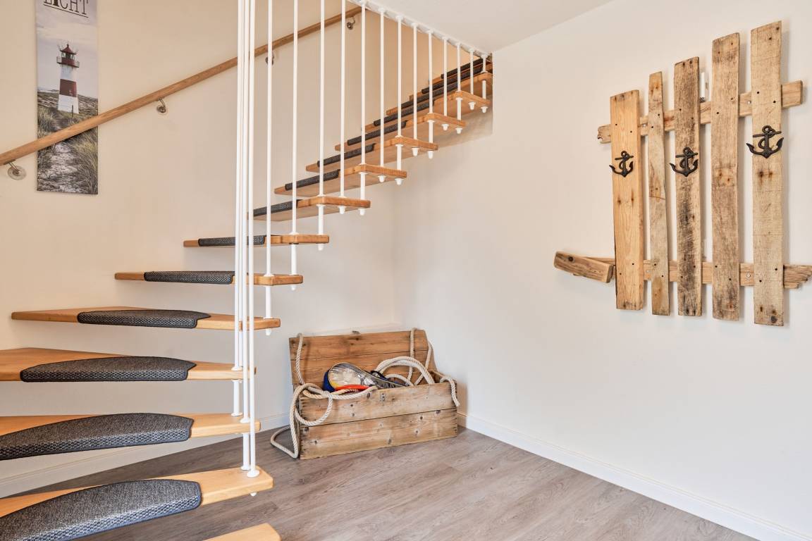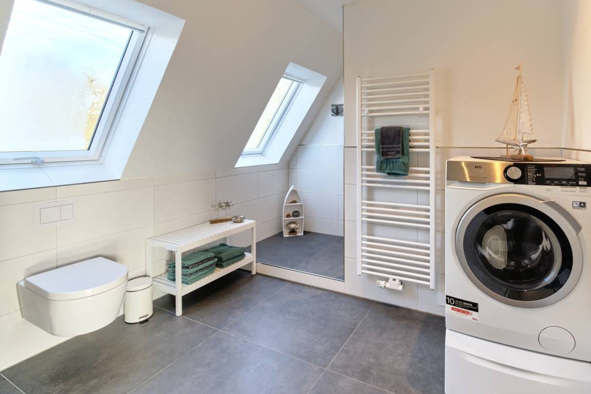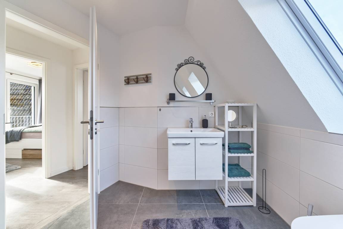Die Wohnung erstreckt sich über zwei Etagen und bietet Platz für bis zu vier Gäste – dein Hund ist ebenfalls herzlich willkommen. Zwei gemütliche Schlafzimmer mit Doppelbetten (180×200 cm [&] 140×200 cm) sorgen für erholsame Nächte. Das moderne Duschbad mit bodengleicher Dusche sowie Waschmaschine mit Trocknerfunktion bietet zusätzlichen Komfort.