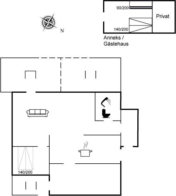SchlafverhältnisseDie Schlafplätze verteilen sich auf 2 Schlafräume. 4 Schlafplätze in Doppelbetten. 2 Schlafplätze in einem Etagenbett. 4 von diesen Schlafplätzen befinden sich im Gästehaus. Ferner steht ein Kinderbett zur Verfügung.