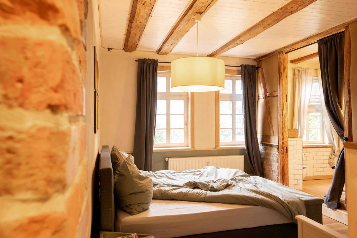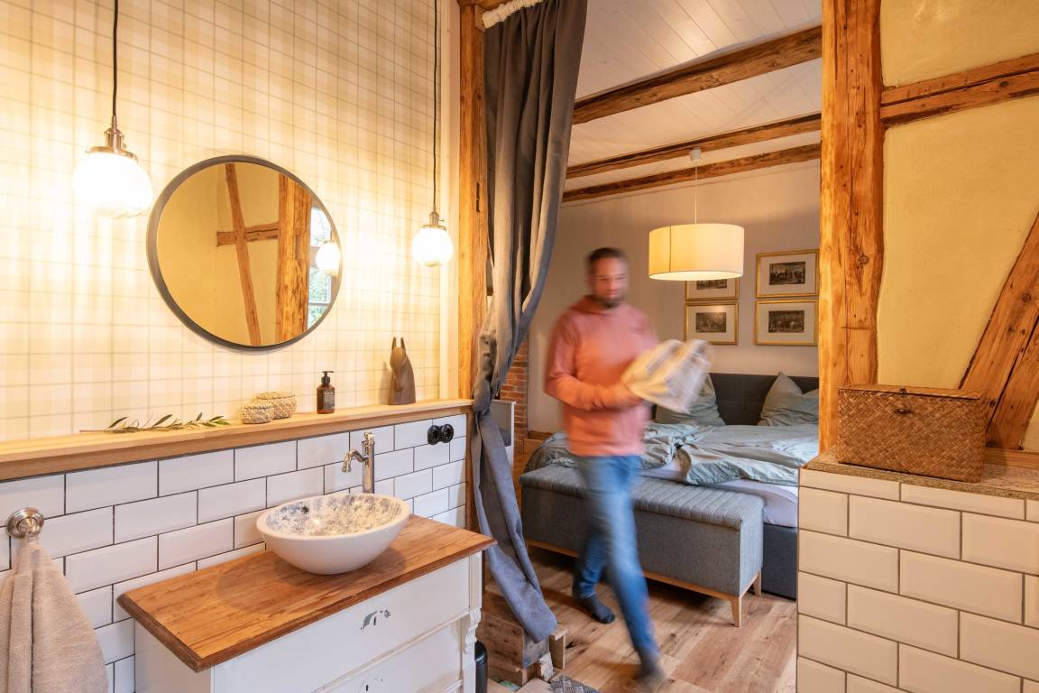 Die Kutscherstube im Hofmeisterhaus auf dem Gutshof Fürstenberg ist als Gästewohnung für zwei Personen (plus Kinder) grundlegend saniert worden. Ein rustikal-edles Ambiente mit Lehmputz und Fachwerkbalken und eine individuelle Ausstattung freuen sich auf begeisterte Blicke und Gäste von nah und fern. Einige der verwendeten Möbelstücke sind Fundsachen von den Dachböden des Anwesens, die wir liebevoll wiederaufbereitet haben und die nun eine ganz eigene Wohnatmosphäre in diesem Denkmal erzeugen.