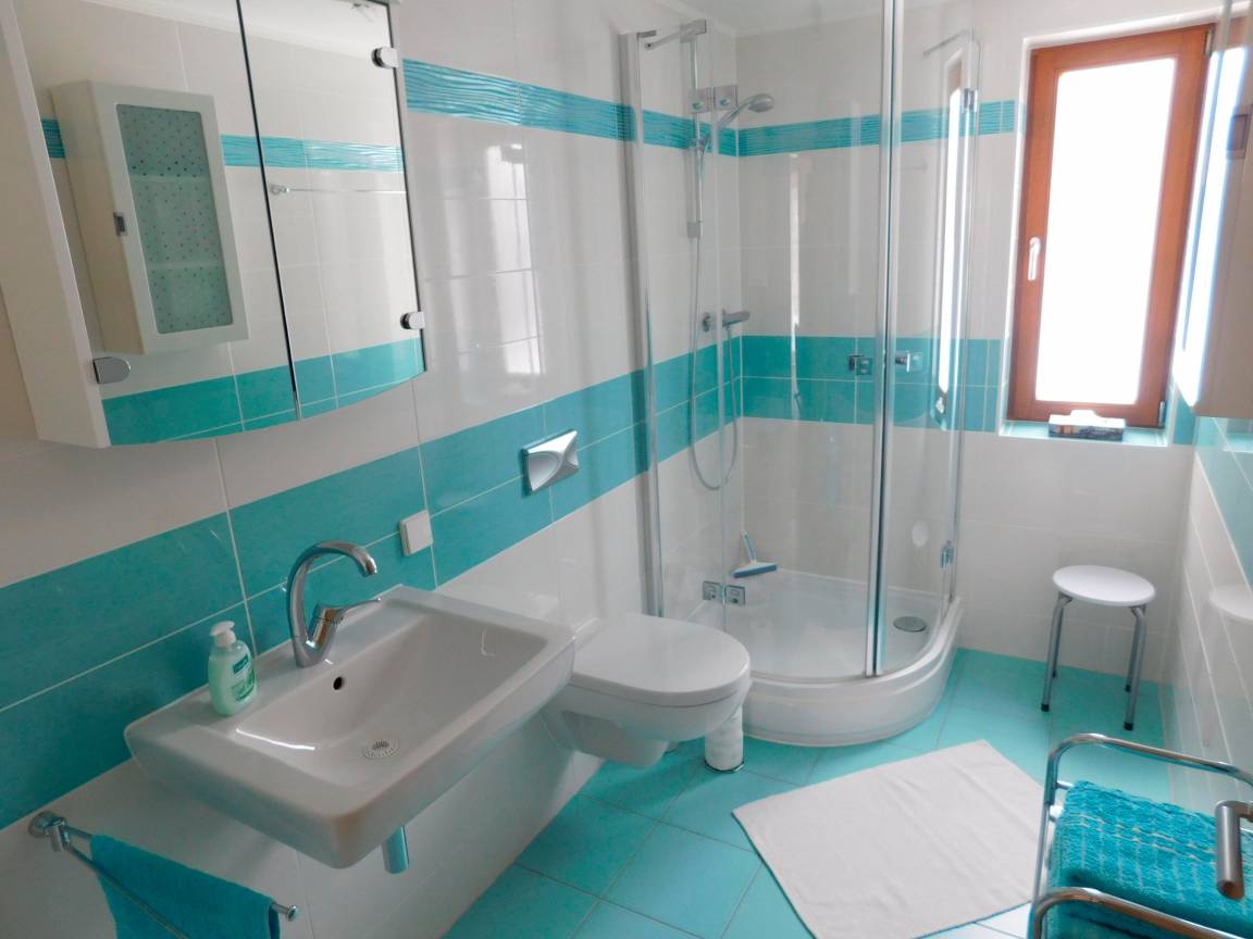 Das helle, moderne Ambiente im Badezimmer 6m² wird Ihnen bestimmt gefallen. Das Bad hat ein separates Fenster und höher hängendes WC und Waschbecken. Es bietet einen gut beleuchtenden 2tlg. Spiegelschrank, einen Badhocker, einen Fön, einen Kosmetikspiegel, einen Hängeschrank und ein Rollelement. Mehrere Handtücher sind einmalig pro Person inklusive.