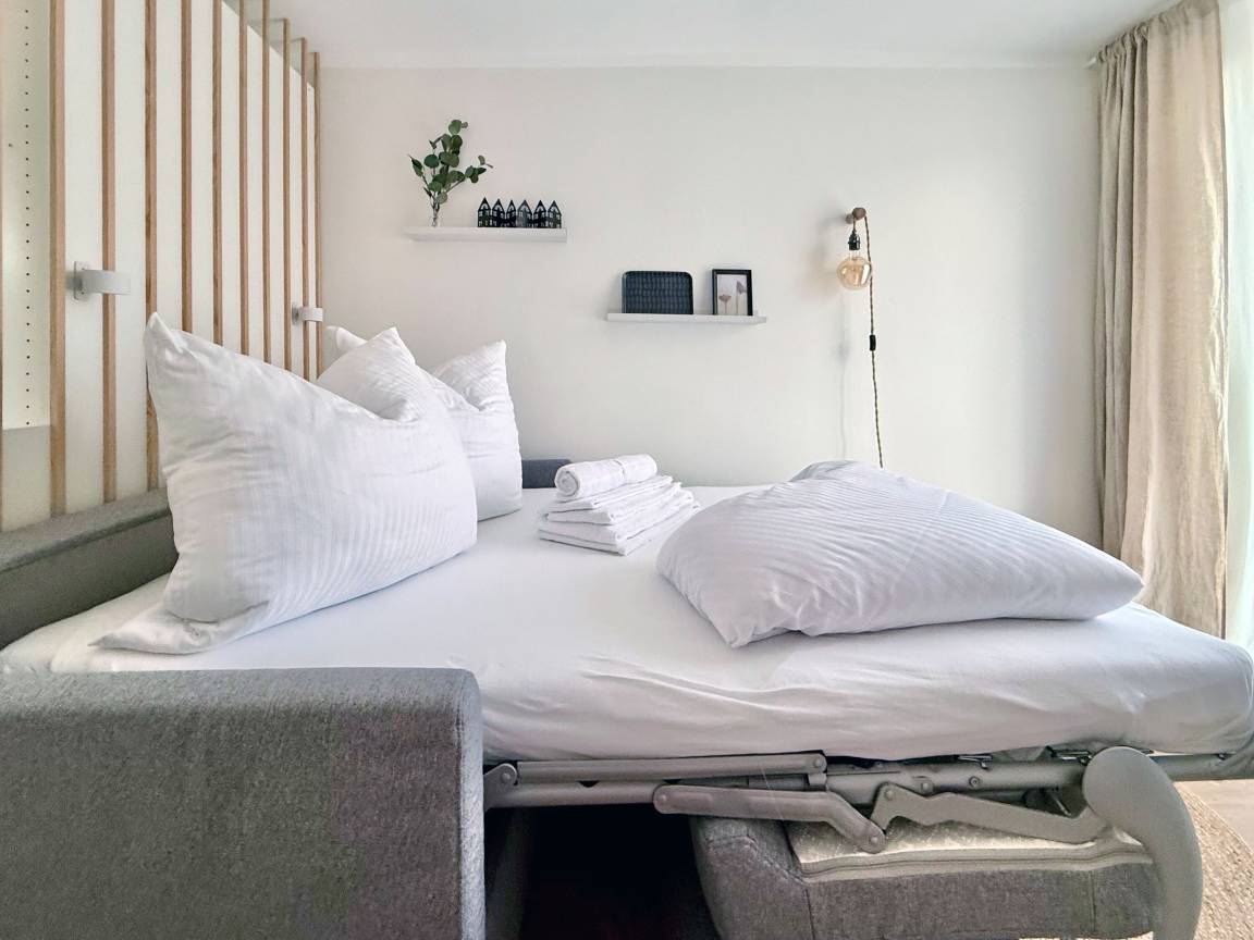 Wichtig zu wissen: Die Wohnung verfügt nicht über ein separates Schlafzimmer, sondern über eine hochwertige Schlafcouch im Wohnbereich, die mit integrierter Matratze für angenehmen Schlafkomfort sorgt – ideal für Paare oder Alleinreisende, die tagsüber unterwegs sind und abends entspannt zur Ruhe kommen möchten.