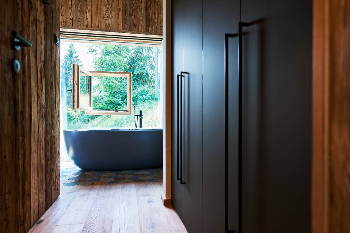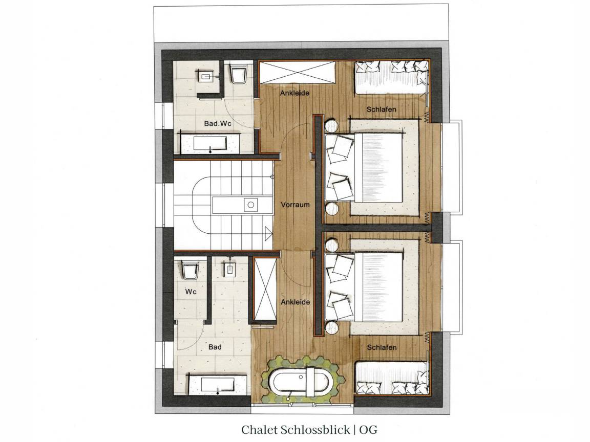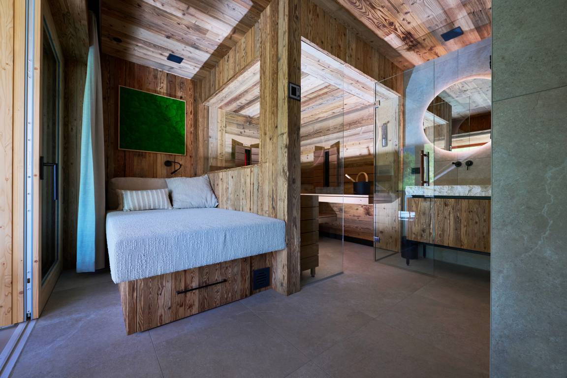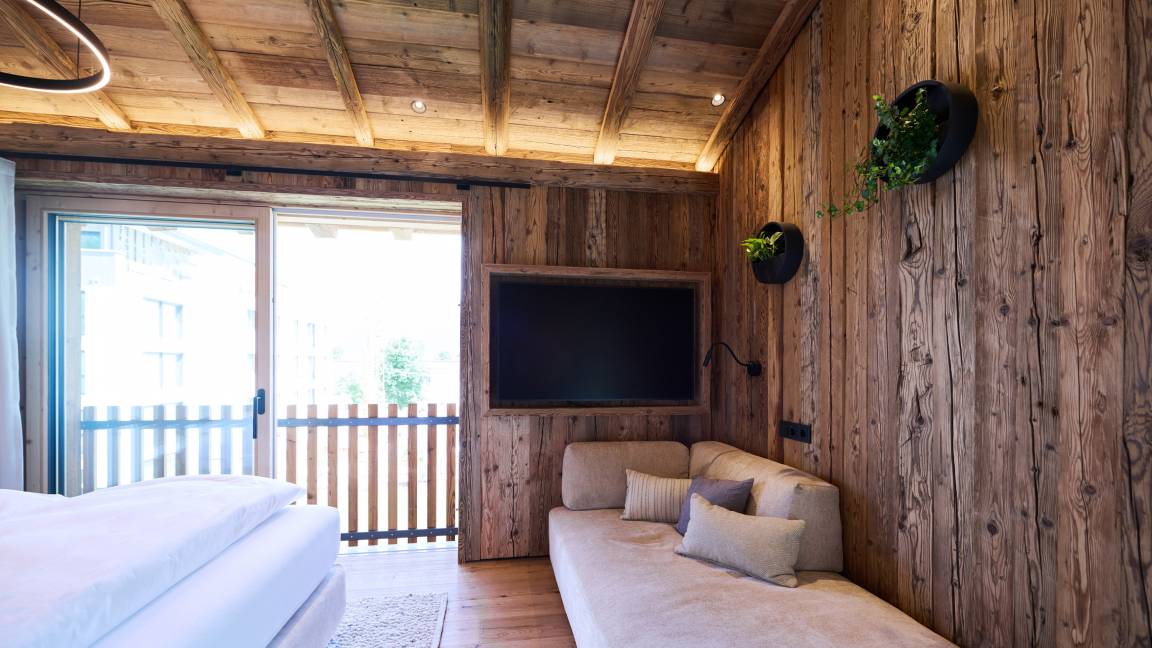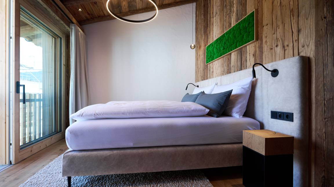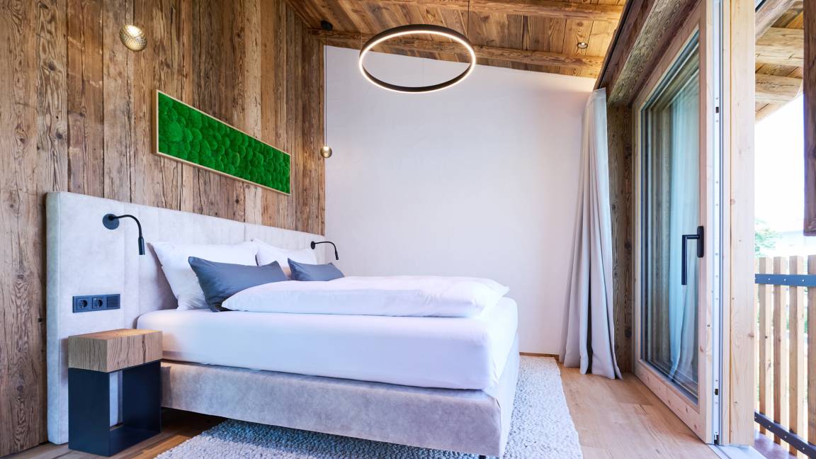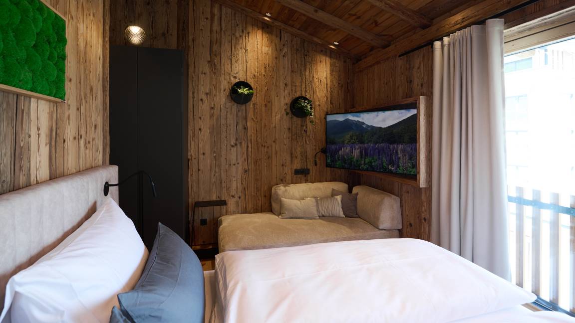 Zwei stilvoll eingerichtete Schlafzimmer bieten komfortabel Platz für bis zu vier Personen. Zusätzlich lädt eine großzügige Wellnessliege im Spa-Bereich (140 × 200 cm) zum Entspannen ein – ideal auch als Schlafplatz für Kinder. Hier gibt es viel Platz für gemeinsame Auszeiten.