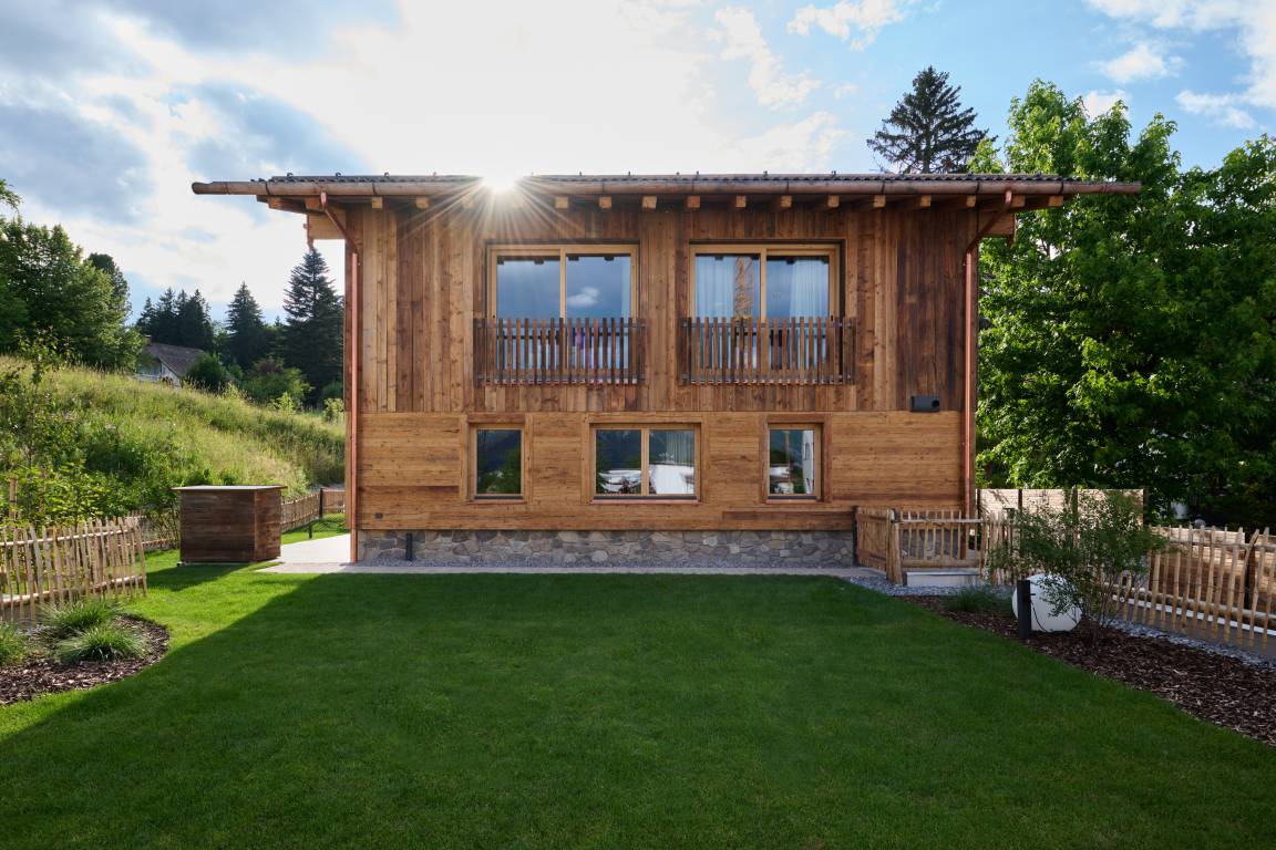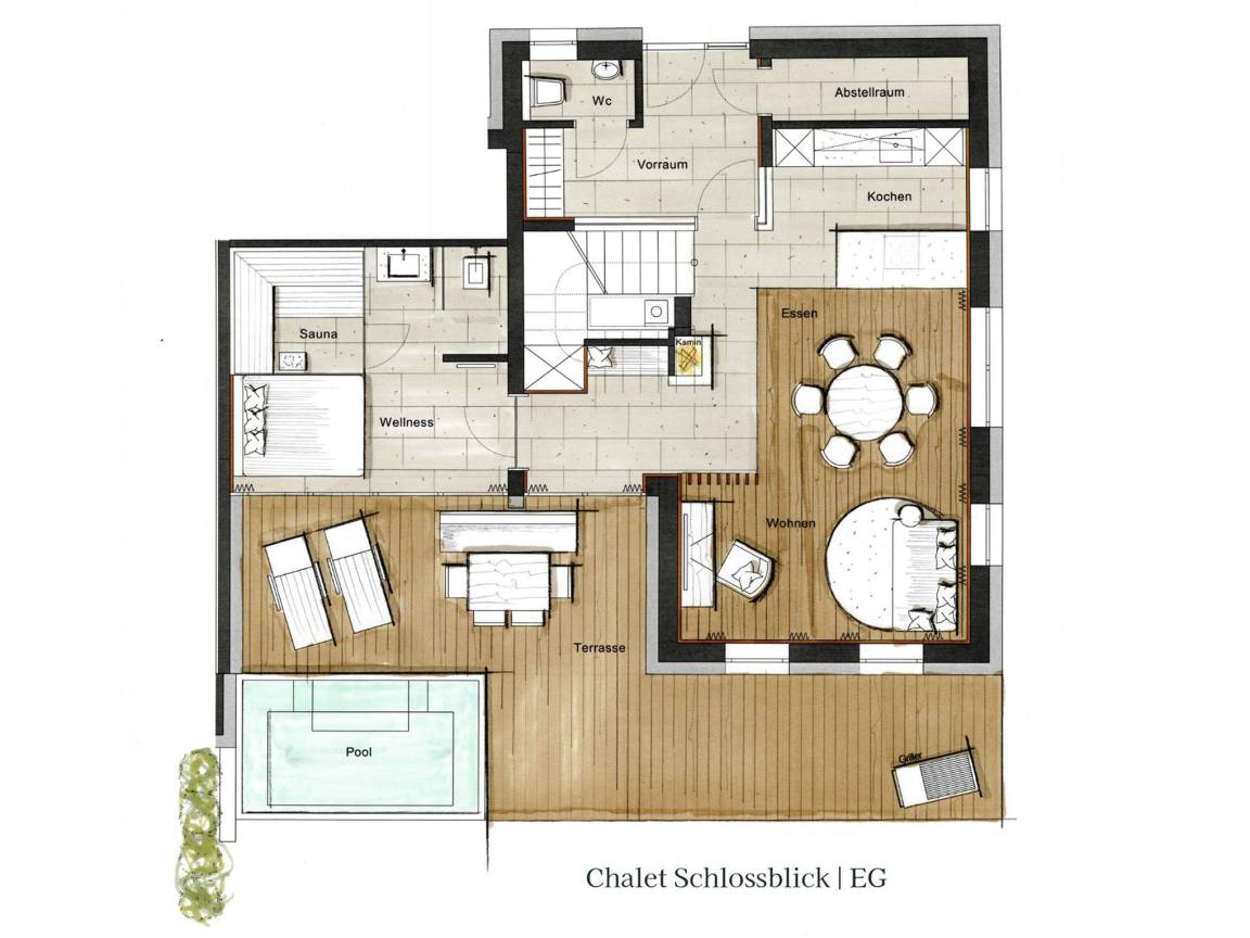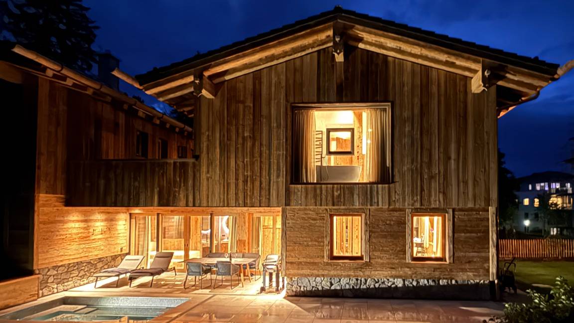 Rundum verwöhnt: Ihre perfekte Küche für den Urlaub! In unseren luxuriösen Chalets erwartet Sie eine voll ausgestattete Küche, die keine Wünsche offen lässt. Kochen und Backen werden zum Vergnügen mit hochwertiger Ausstattung wie der DeLonghi Nespresso Kaffeemaschine für aromatische Kaffeekreationen, einem hochwertigen Backofen für gesunde Genussmomente, einem modernen Cerankochfeld und einem Weber Elektrogrill im Garten für unvergessliche Grill-Erlebnisse. Genießen Sie kulinarische Höhepunkte in Ihrem ganz persönlichen Ferienparadies und verwöhnen Sie Ihren Gaumen mit exklusiven Kreationen. Für die Genießer bieten wir in jedem Chalet einen Weinkühlschrank – auf Wunsch bestücken wir diesen gerne mit köstlichen Champagner Louis Roederer und erlesenen Hausweinen aus einer exklusiven Sonderabfüllung eines renommierten deutschen Weinherstellers. Lassen Sie sich von einem unvergleichlichen Urlaubserlebnis mit exzellenter Ausstattung verwöhnen und genießen Sie den Geschmack von Luxus bei jedem Bissen! Die private Sauna ist mit zwei Infrarot-Rückenstrahlern ausgestattet und sorgt für tiefenwirksame Entspannung nach einem aktiven Tag. Im beleuchteten Außenpool mit edler Mosaik-Oberfläche erleben Sie pure Erholung. Der breite Einstieg an der Längsseite dient als komfortable Sitzfläche – ideal zum Relaxen mit einem Glas Wein im Sonnenuntergang. Integrierte Massagesitzplätze verwöhnen Sie zusätzlich, während das 127 cm tiefe Becken genügend Platz für Erfrischung und Entspannung bietet – ob allein, zu zweit oder mit der Familie.