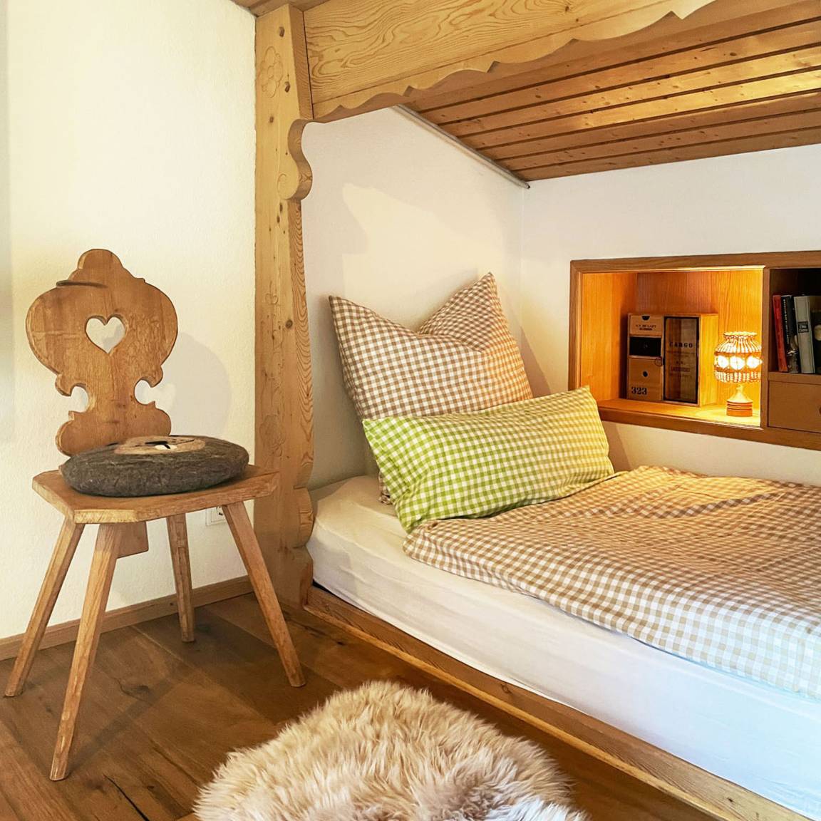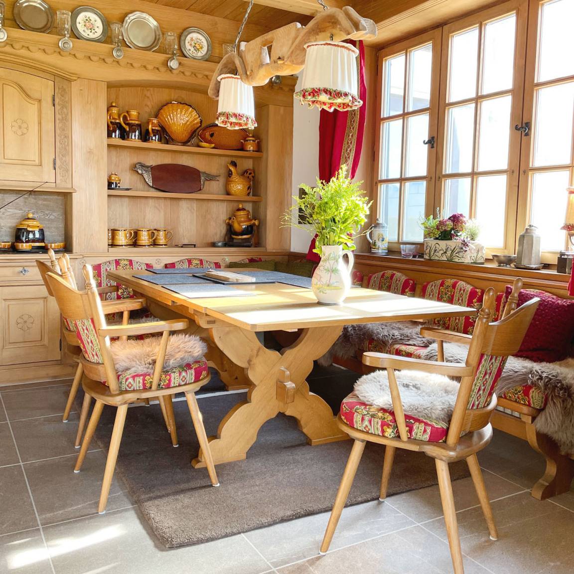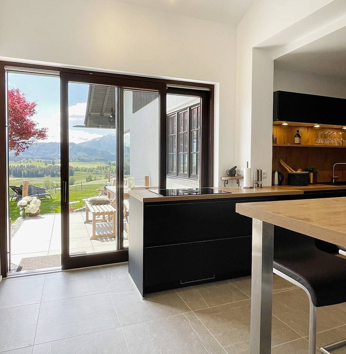 Über die Diele mit Windfang gelangt man ins Entree dass Sie zur großen, modernen mit allen nötigen Küchengeräten ausgestatteten Küche mit Bartresen führt. Die Küche ist voll ausgestattet mit z.b einem modernen Backofen, Kapselmaschine (Nespresso) mit 10 Kapseln, Kaffeemaschine, Kaffeevollautomat mit Bohnenfüllung, Filter zum Aufbrühen, Teebeutel, Eierkocher und Eismaschine. Ein Logenplatz der besonderen Art, Kochen mit Ausblick. Von hier aus genießen Sie bereits Schloss- und Bergblick, mit direktem Zugang zur ostseitigen, großen Frühstücksterrasse. In der angrenzenden rustikalen Bauernstube mit geselliger Sitzecke findet sich ausreichend Platz für die ganze Familie. Ein Highlight ist hier außerdem ein typisch regionaler Kachelofen, beheizbar mit Holz aus dem Dielenbereich.
