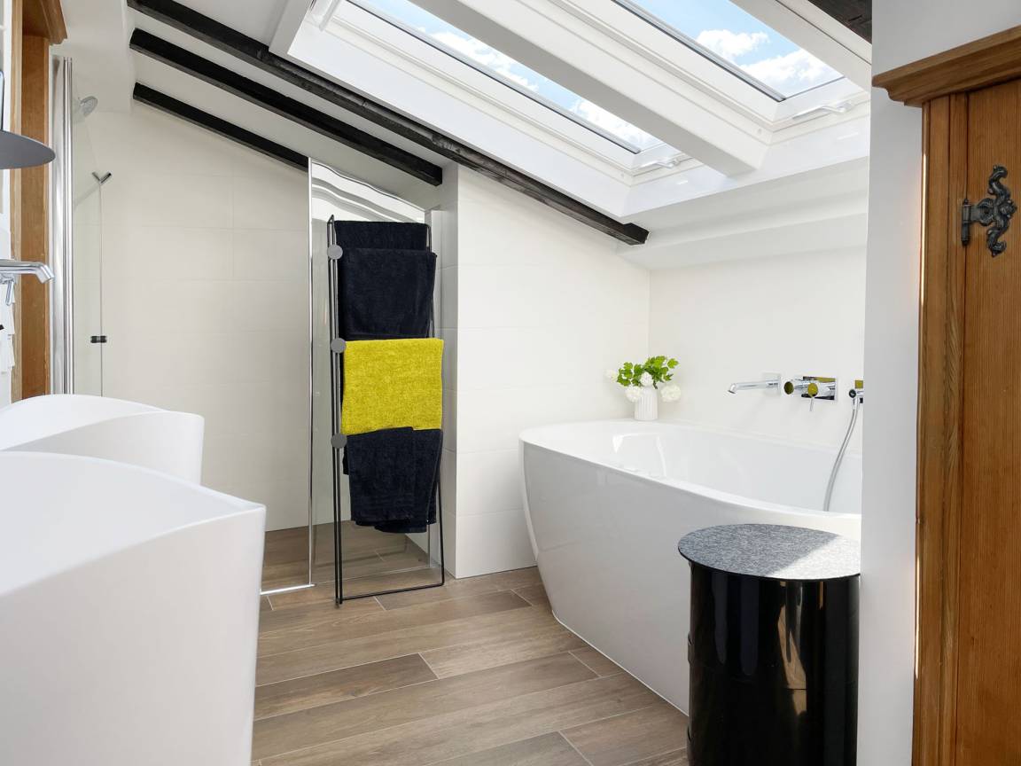 Eine Treppe im Entree führt ins Obergeschoss zu den Schlafräumen. Dort befindet sich ein großes Schlafzimmer mit Kingsize-Bett (2x2 Meter) mit einem eigenem etwas kleineren, sehr modernem Bad mit WC, Waschbecken und Dusche, sowie auf der Empore (westlich) ein Schlafzimmer mit zwei Einzelbetten im Kojen-Stil, mit einem unvergleichbarem, rustikalem und urgemütlichem Charme, der besonders bei Kindern sehr beliebt ist. Nebenan steht ein drittes Schlafzimmer mit Doppelbett (160x200) zur Verfügung. Zu diesen beiden Schlafzimmern gibt es ein weiteres, modernes Badezimmer mit Dusche, 2 Waschbecken, WC und Badewanne auf derselben Etage. Alle Schlafzimmern sind jeweils mit einem neu/modernen Flachbildfernseher mit Prime-Video ausgestattet.