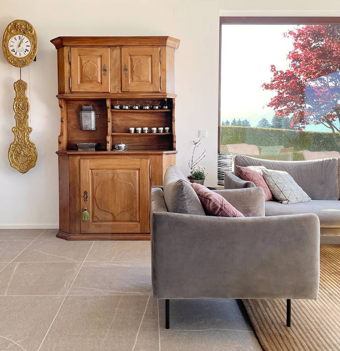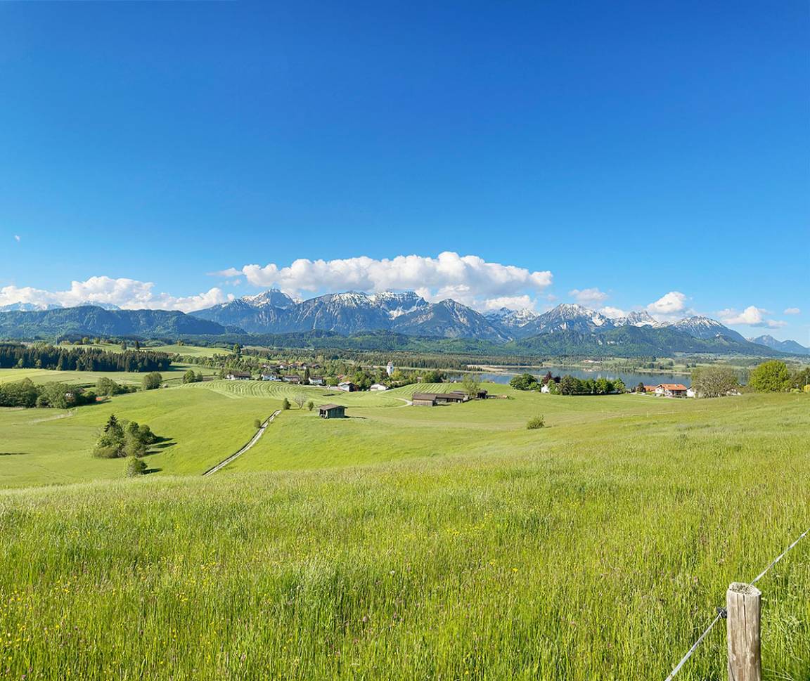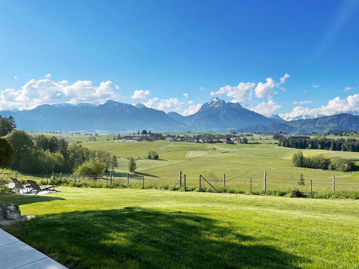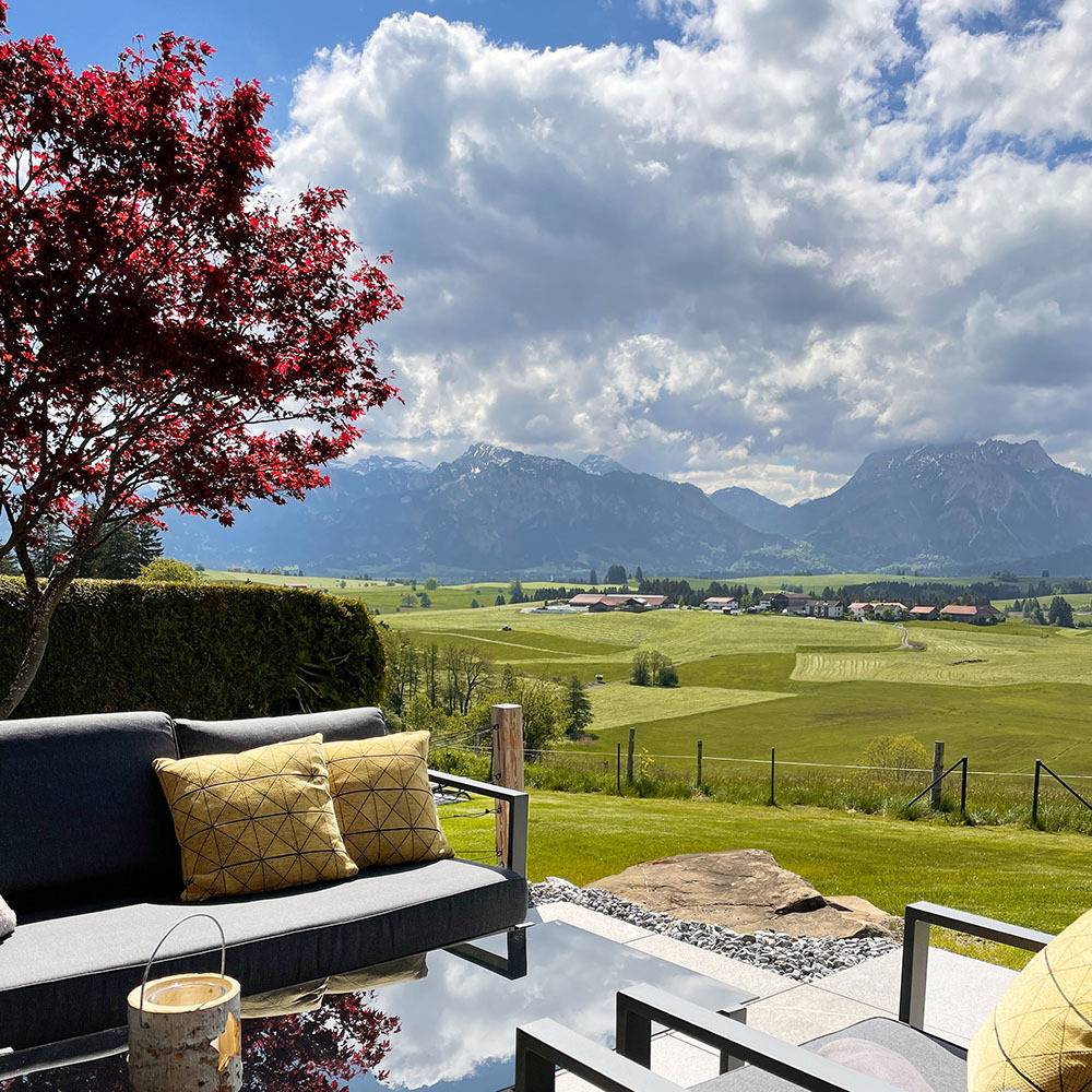 Das große, voll verglaste und somit sehr freundliche Wohnzimmer mit moderner Sofalounge bietet einen atemberaubenden Blick auf den Hopfensee, die Allgäuer Berge sowie die Königsschlösser, Schloss Neuschwanstein. Dazu gelangen Sie vom Wohnzimmer aus, direkt zur Sonnenterrasse - Ihr Logenplatz unter freiem Himmel, mit demselben atemberaubenden Ausblick. Genießen Sie königliche Stunden in diesem bezaubernden Ambiente.