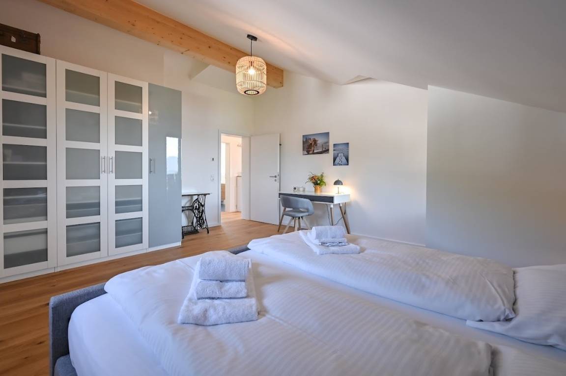 Es gibt zwei Schlafzimmer. Das geräumige Master hat ein großes Doppelbett, einen geräumigen Kleiderschrank, einen Schreibtisch und einen Zugang zum Balkon. Auch vom kleineren Schlafzimmer mit zwei Einzelbetten hat man Seeblick. Das helle Tageslichtbad hat ein großes Waschbecken und eine Badewanne mit Regendusche.