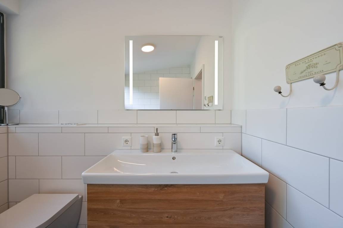 Die Küche ist voll ausgestattet mit Spülmaschine, Ceran-Kochfeld, Backofen, Dunstabzugshaube, Kühl-/Gefrierschrank-Kombination, Mikrowelle, Toaster und Pad-Kaffeemaschine.