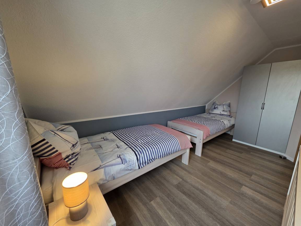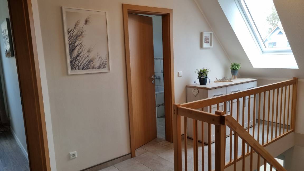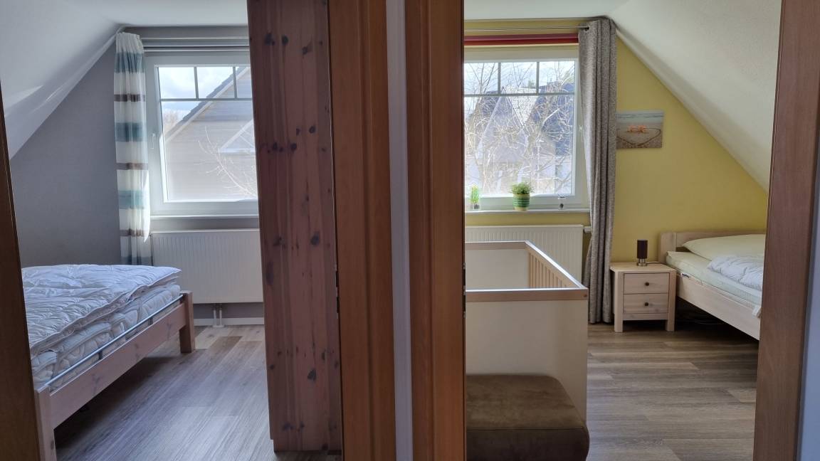 Im OG befinden sich die drei Schlafzimmer und das Bad mit Dusche und Badewanne mit Blick auf den Bodstedter Bodden. Zwei Schlafzimmer sind mit Doppelbetten 180x200, das dritte mit zwei Einzelbetten 90x200 und einem Kinderbett 70x140 ausgestattet. Kleiderschränke sind in jedem Schlafzimmer vorhanden.