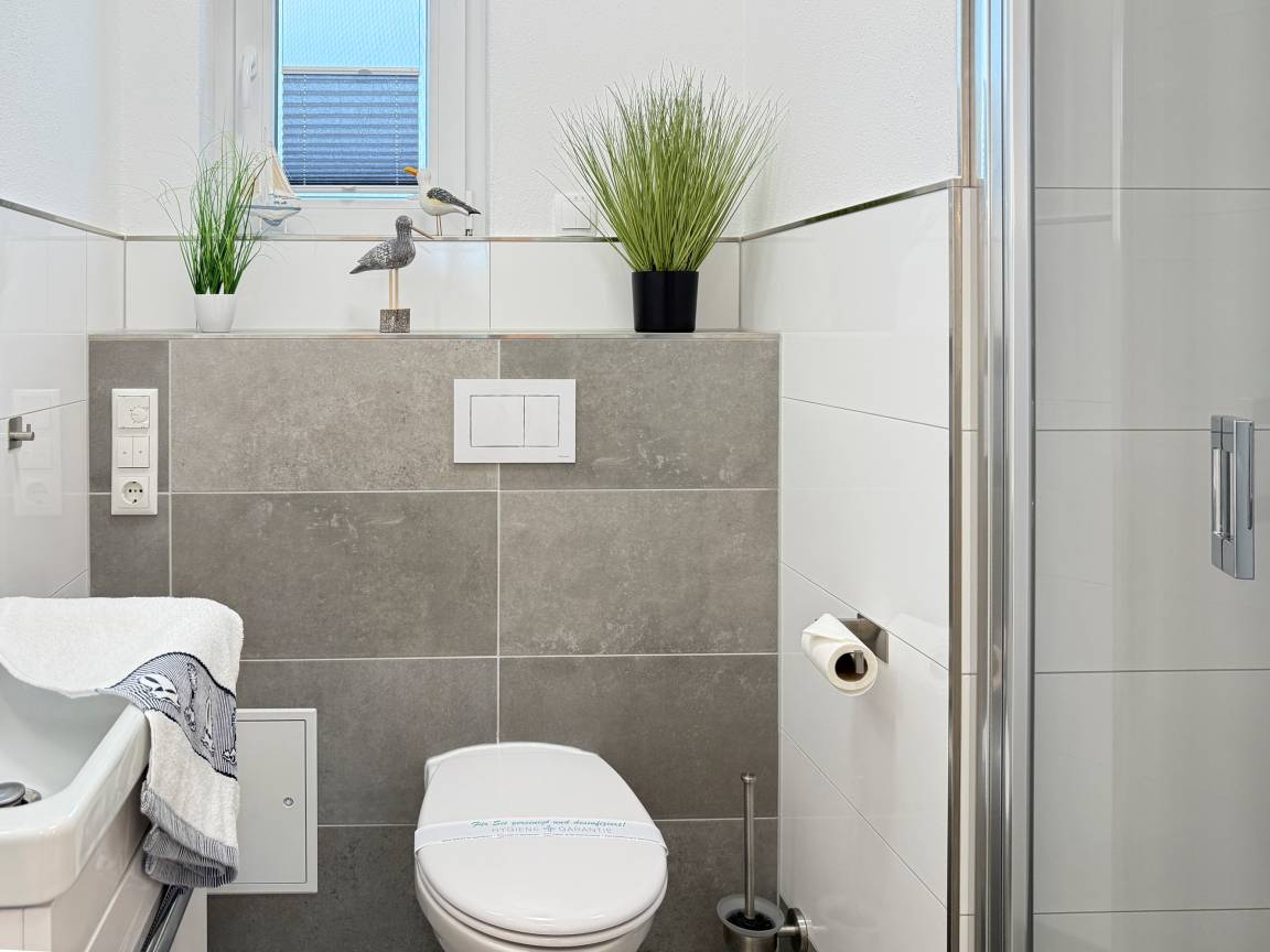 Badezimmer: Zwei moderne Duschbäder mit ebenerdiger Dusche, WC und angenehmer Fußbodenheizung