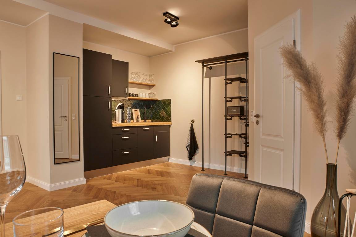 Die Wohnung liegt im Erdgeschoss und verfügt über einen eigenen Eingang. Der großzügige Wohnschlafraum bietet genügend Raum für den gemütlichen Sitzbereich sowie das große Premium-Boxspringbett. Die offene Designküche ist -bis auf einen Ofen- voll ausgestattet und enthält neben Kühlschrank, Herd und Spülmaschine auch Gläser, Geschirr, Besteck, Weinöffner und alles Weitere was Sie für ein leckeres Frühstück oder ein gemeinsames Abendessen benötigen. Mit der Nespresso-Vertuo Machine inkl. einer kostenlosen Erstausstattung an Kapseln bereiten Sie am Morgen nach dem Aufstehen den perfekten Kaffee und am Nachmittag Ihren leckeren Espresso zu. Die Wohnung verfügt außerdem über kostenfreies WLAN einen 4K-LED-TV sowie einen hochwertigen Bluetooth-Lautsprecher.