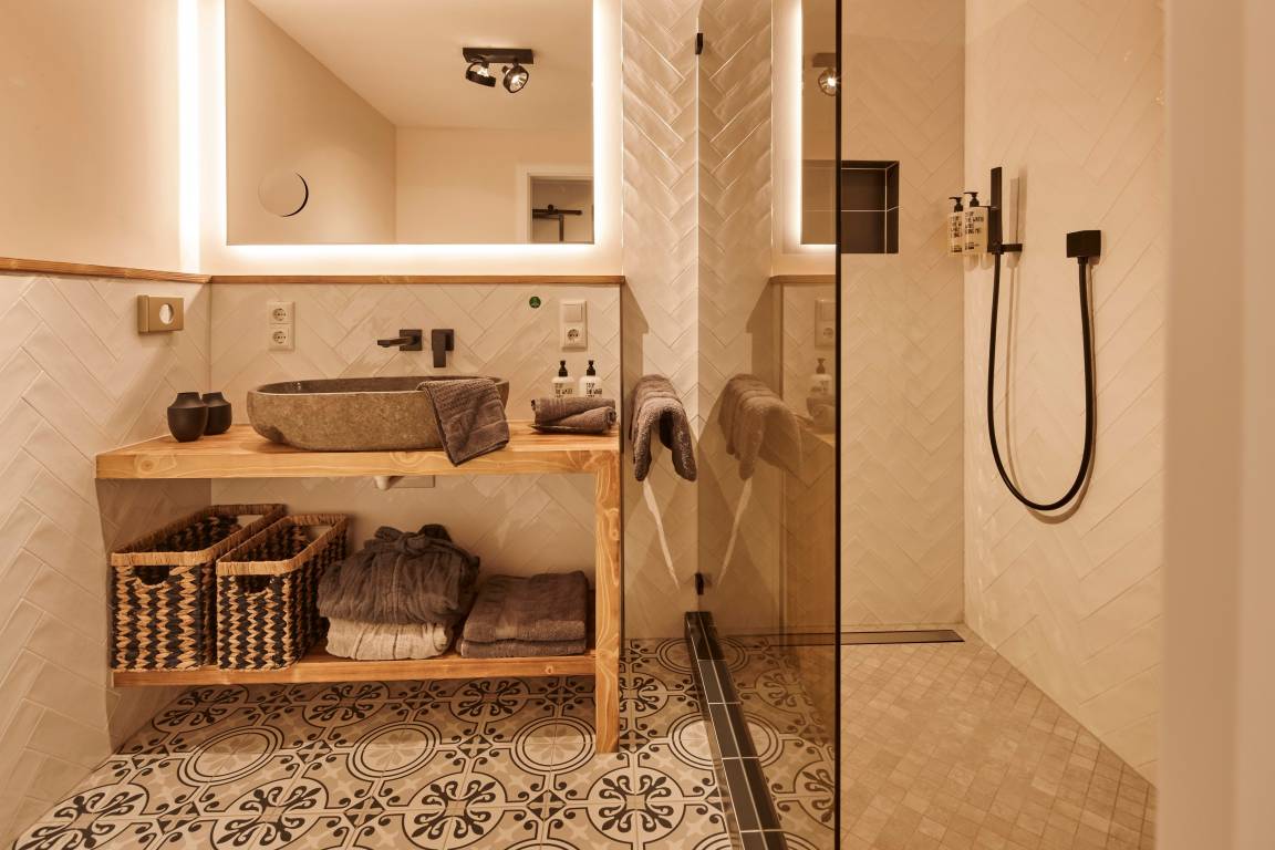 Aus dem Eingangs-/Flurbereich gelangen Sie in das Bad mit großzügiger begehbarer Rain-Shower-Dusche, Designfliesen und hochwertigsten Armaturen. Ihnen als Gast stehen sowohl flauschige Handtücher (im Wäschepakt enthalten) sowie wohlduftende Pflegeprodukte der nachhaltigen Kosmetiklinie Stop Water while using me kostenfrei zur Verfügung.