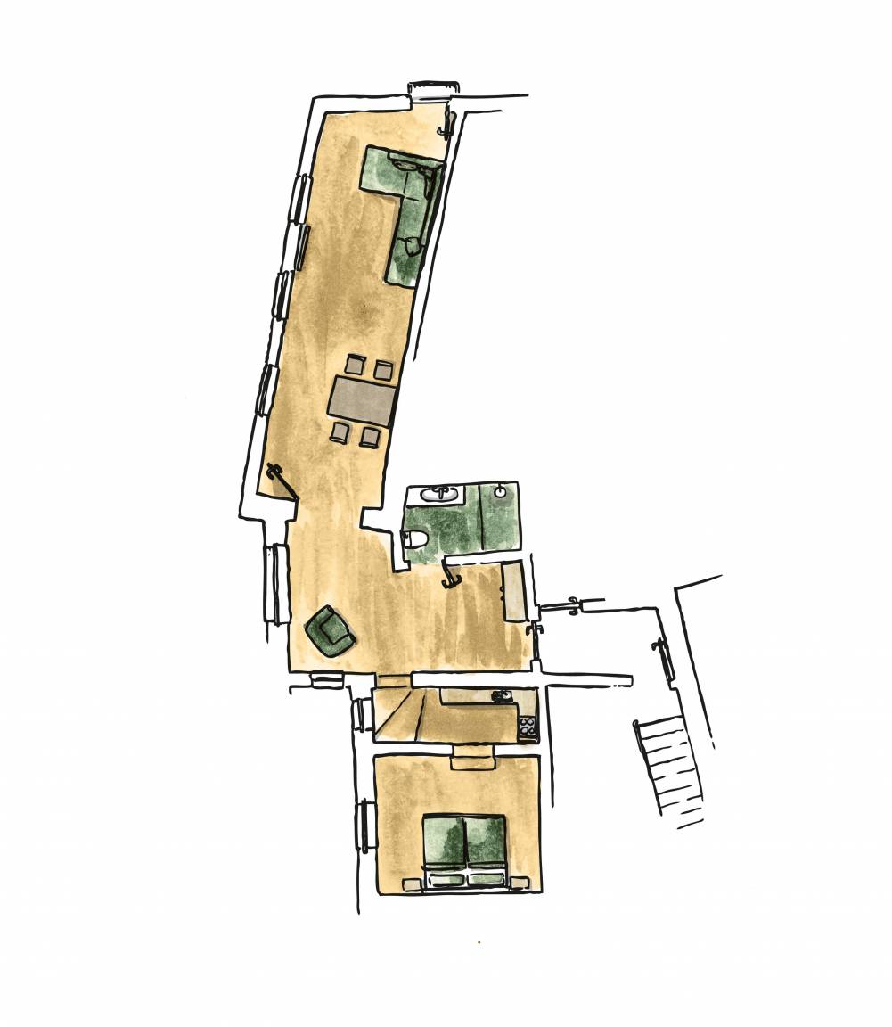 Die Wohnung liegt im 1. Obergeschoß und verfügt über einen eigenen Eingang. Die Wohnung erstreckt sich mit einer Größe von 60qm über mehrere kleine „Splitlevel" und hat somit einen ganz besonders individuellen und gemütlichen Schnitt, bietet aber dennoch sehr viel Platz. Der großzügige, lichtdurchflutete Wohnraum bietet genügend Platz für den Essbereich sowie das gemütliche 3er Sofa für entspannte Abende zu zweit. Ob gemeinsamer Fernsehabend oder gemütliche Stunden bei einem Glas Wein – hier haben Sie alle Möglichkeiten. An den Flurbereich schließt die kleine Designküche an. Sie ist -bis auf einen Ofen- voll ausgestattet und enthält neben Kühlschrank, Herd und Spülmaschine auch Gläser, Geschirr, Besteck, Weinöffner und alles Weitere was Sie für ein leckeres Frühstück oder ein gemeinsames Abendessen benötigen. Mit der Nespresso-Vertuo Machine inkl. einer kostenlosen Erstausstattung an Kapseln bereiten Sie am Morgen nach dem Aufstehen den perfekten Kaffee und am Nachmittag Ihren leckeren Espresso zu. Auf dem unterem Splitlevel befindet sich das gemütliche Schlafzimmer mit Premium-Boxspringbett und einem weiterem TV-Gerät. Die Wohnung verfügt außerdem über kostenfreies WLAN zwei 4K-LED-TV sowie einen hochwertigen Bluetooth-Lautsprecher.
