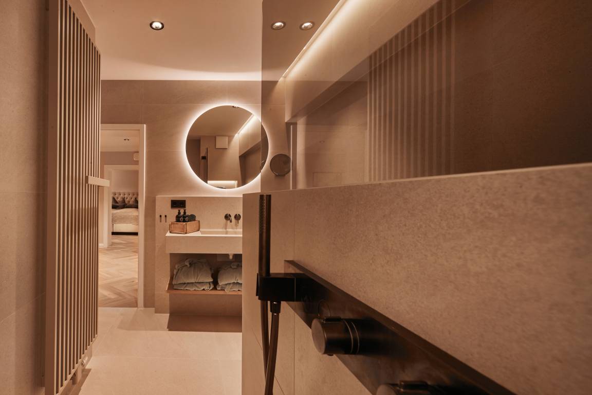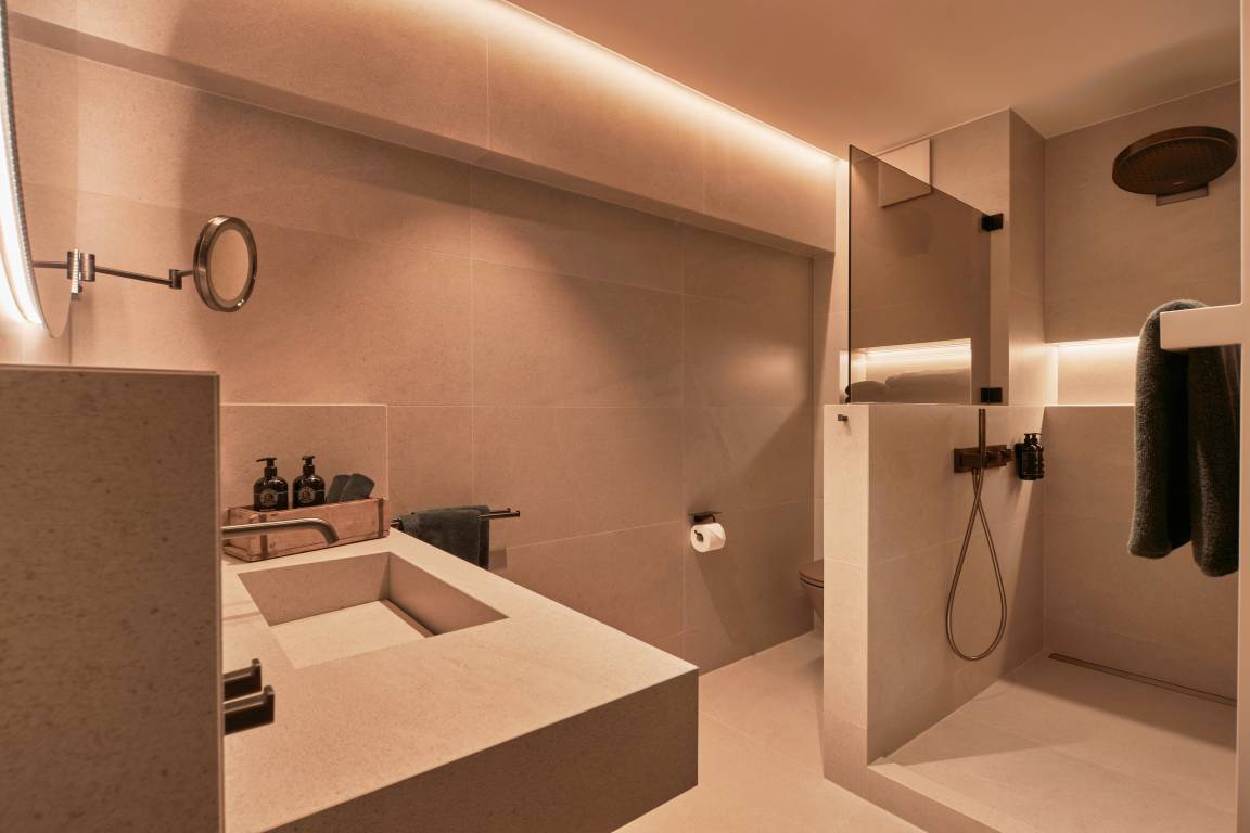 Aus dem Wohn-, Essbereich gelangen Sie in das Bad mit großzügiger begehbarer Rain-Shower-Dusche, Designfliesen und hochwertigsten AXOR-Armaturen. Ihnen als Gast stehen sowohl flauschige Handtücher (im Wäschepakt enthalten) sowie wohlduftende Pflegeprodukte der nachhaltigen Kosmetiklinie The Botanist & The Chemnist kostenfrei zur Verfügung.