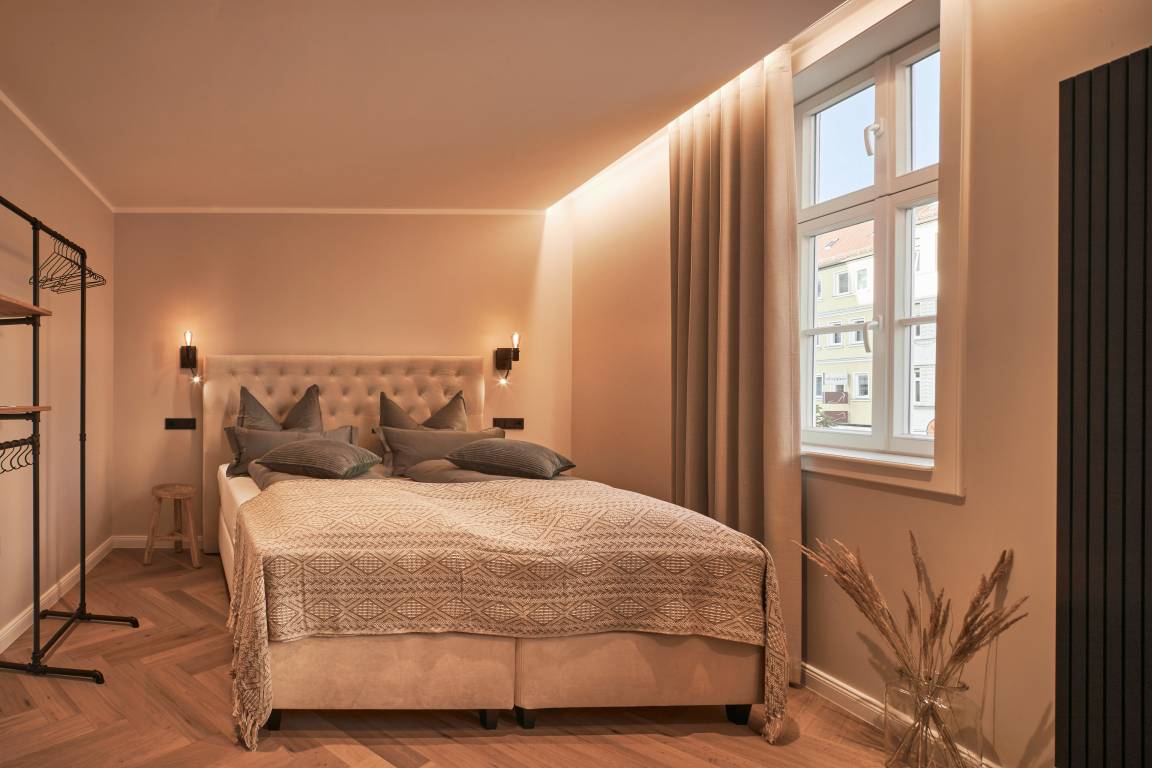 Die Premium Suite Violine für bis zu 4 Personen liegt im 2. Obergeschoß des historischen Mollenhauerhauses und verfügt über einen eigenen Eingang. Die Wohnung erstreckt sich mit einer Größe von ca. 70qm über 2 Schlafzimmer -eins davon mit gemütlicher Sitzecke-, 1 Esszimmer mit Küche und TurmBar und ein großzügiges Designer-Bad. Der individuelle Schnitt ist gemütlich und bietet die perfekte Aufteilung für eine Familie, 2 Paare oder einen Freundinnen-Trip zu viert. Im lichtdurchfluteten Wohn-, Esszimmer findet man ausreichend Platz für ein gemeinsames Abendessen zu viert oder entspannte Stunden zu zweit. Das besondere Highlight dieses herrschaftlichen Raumes ist der Erker mit unserer turmBAR, aus dem man einen wundervollen Blick auf den pulsierenden Platz Unterm Heilig Kreuz hat.