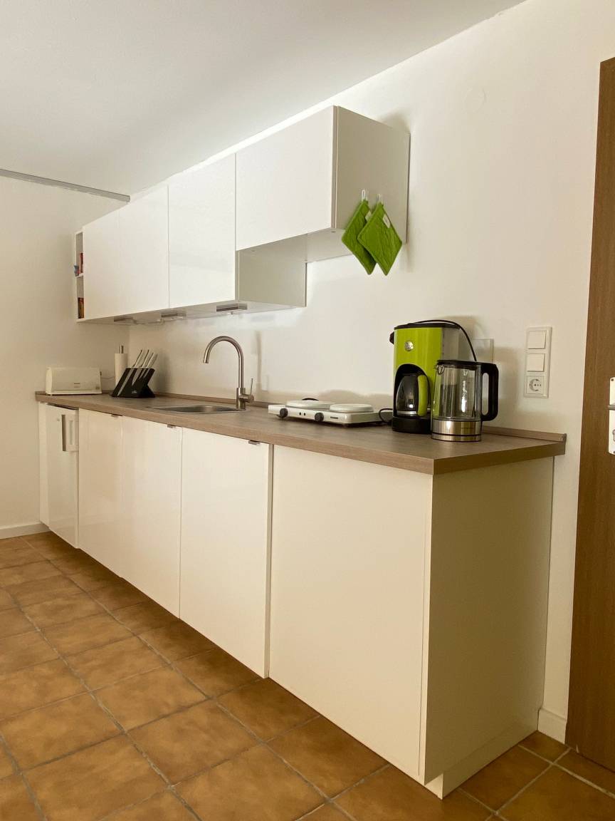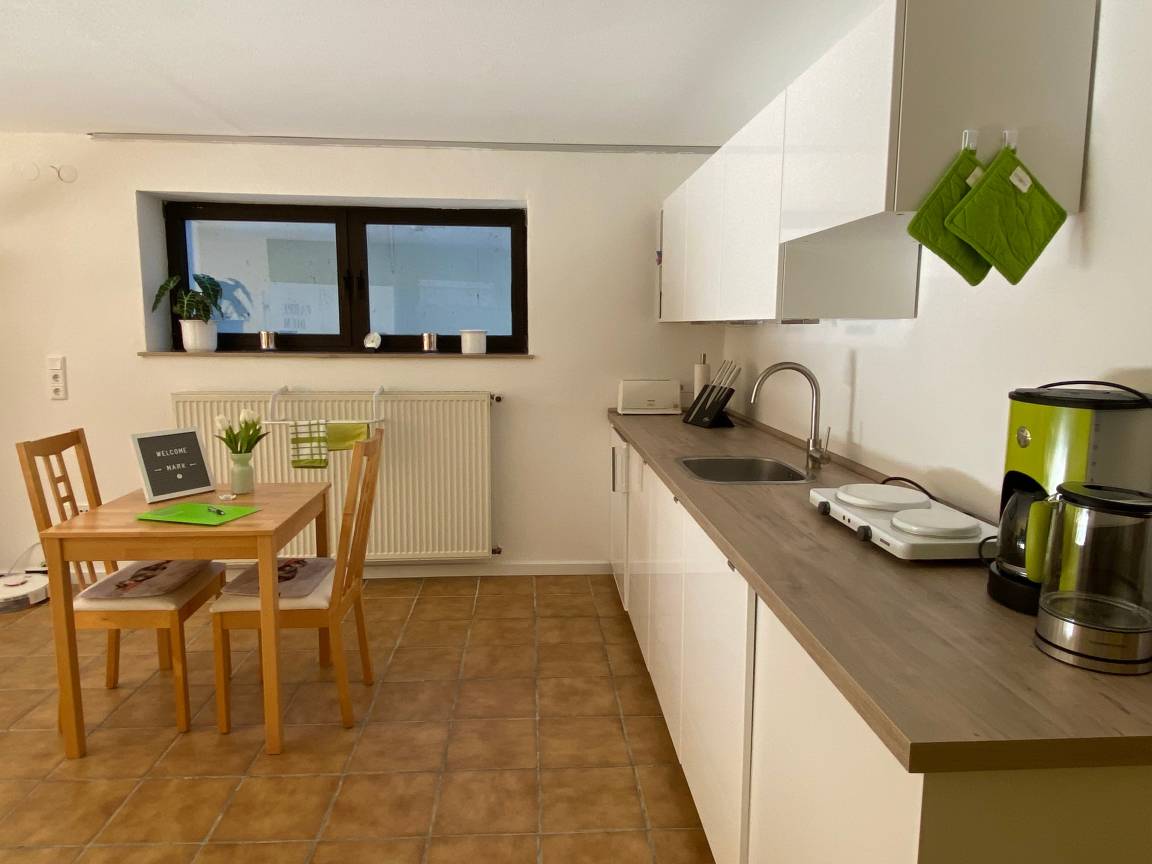 Auf ca. 55 qm gibt es in dieser Souterrainwohnung eine kleine Küche mit Ceranfeld, Backofen und Dunstabzugshaube, Kühlschrank mit Gefrierfach, Geschirrspüler und Esstisch für drei Personen. Toaster, Entsafter und Eierkocher sowie ein Handmixer und diverse Küchenhelfer stehen zur Zubereitung gesunder Mahlzeiten oder Snacks zur Verfügung.