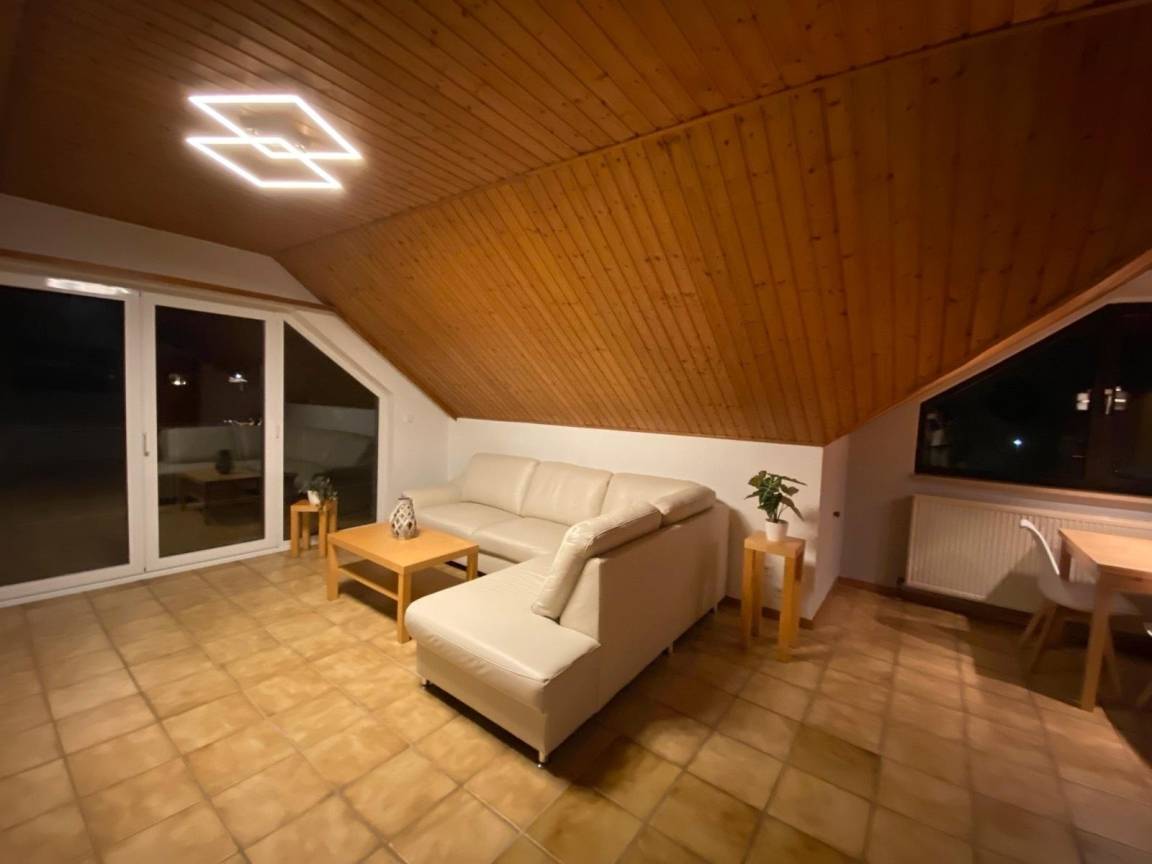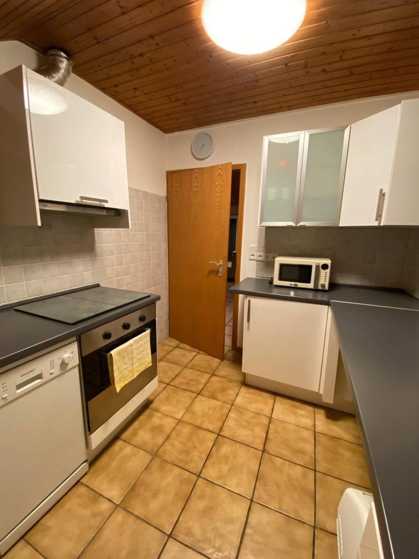 Auf ca. 63 qm gibt es in dieser Dachgeschosswohnung eine kleine Küche mit Ceranfeld, Backofen und Dunstabzugshaube, Kühlschrank mit Gefrierfach, Geschirrspüler und Esstisch für drei Personen. Toaster, Entsafter und Eierkocher sowie ein Handmixer und diverse Küchenhelfer stehen zur Zubereitung gesunder Mahlzeiten oder Snacks zur Verfügung.