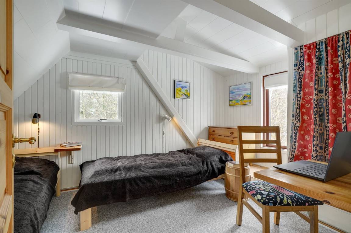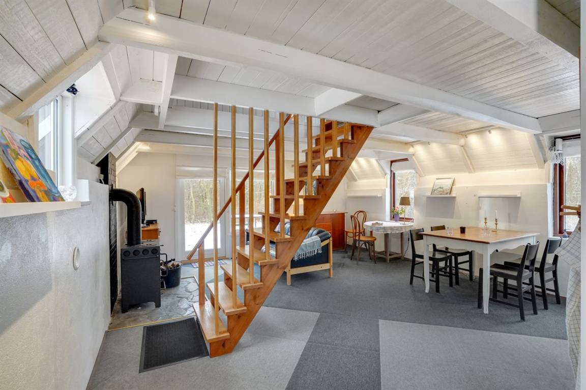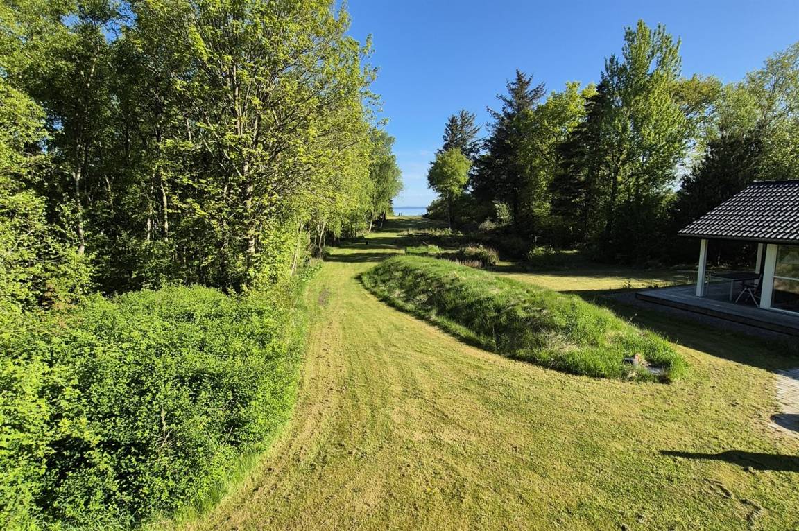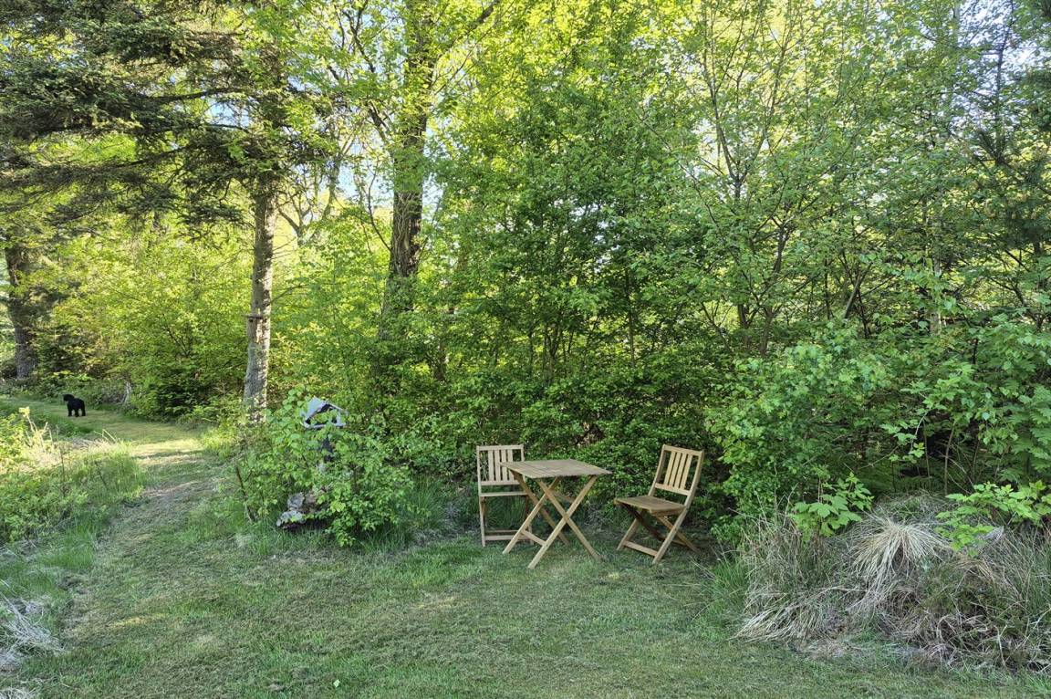 Die Ferienhäuser liegen auf einem großen Grundstück in einer Gegend mit einem kleinen Waldstück zwischen den Häusern und der Schotterstraße. Das Grundstück reicht direkt bis zum Fjord, wo du die Möglichkeit hast, ein kleines Boot oder Kajaks/Kanus liegen zu lassen und von dort aus loszufahren. Es gibt eine Treppe hinunter zum Strand. Das Wasser ist auf dem ersten Stück im Fjord flach, sodass du dort sicher baden kannst. Ein paar Meter draußen gibt es einen Steinstreifen, danach folgt jedoch Sandboden – also denk an deine Badeschuhe.