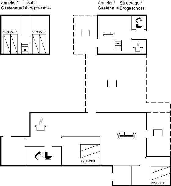 SchlafverhältnisseDie Schlafplätze verteilen sich auf 4 Schlafräume. 8 Schlafplätze in Einzelbetten. 4 von diesen Schlafplätzen verteilen sich auf 2 Schlafzimmer im Gästehaus. Ferner steht ein Kinderbett zur Verfügung.