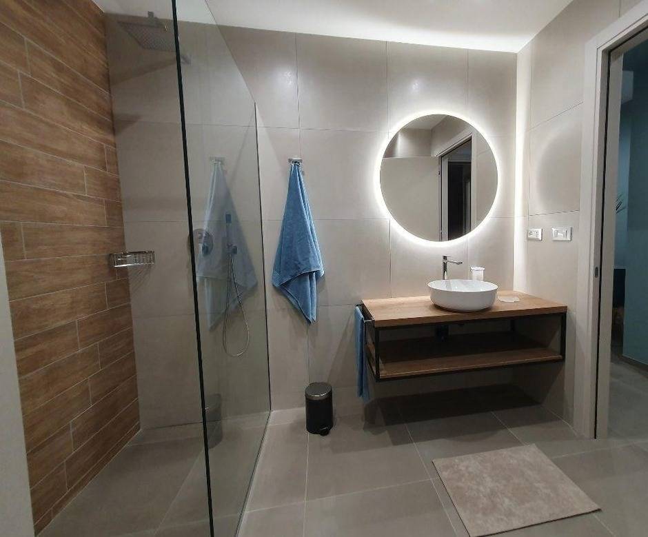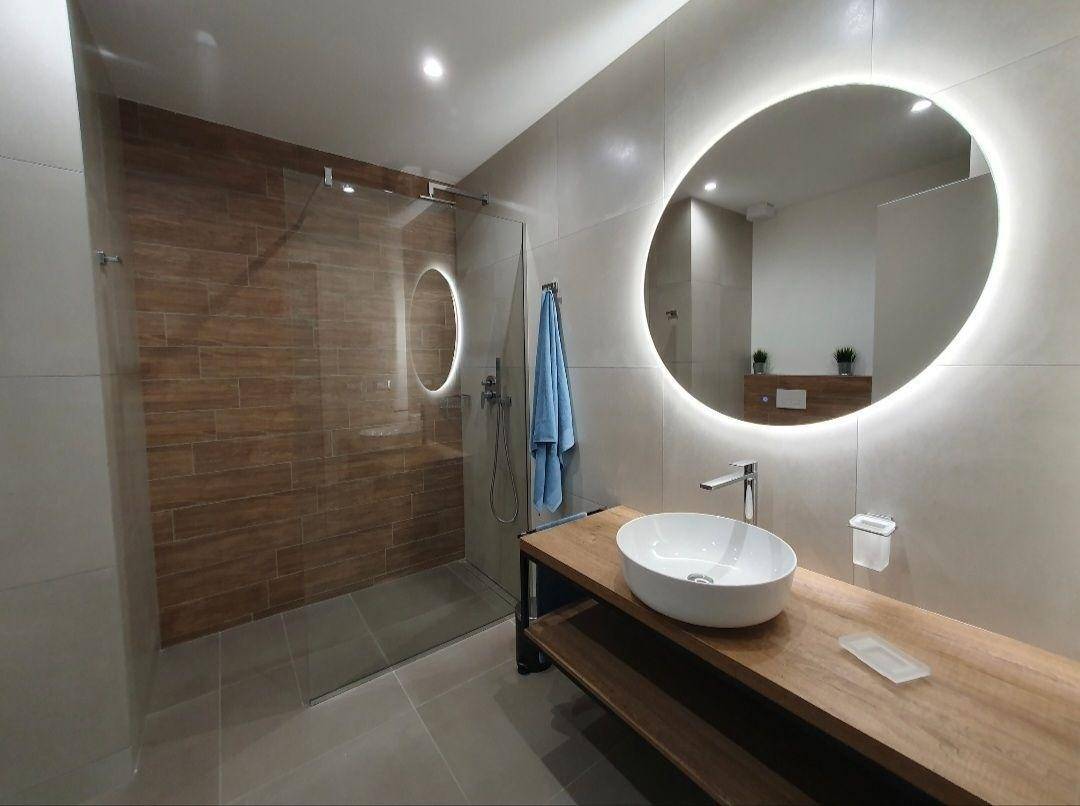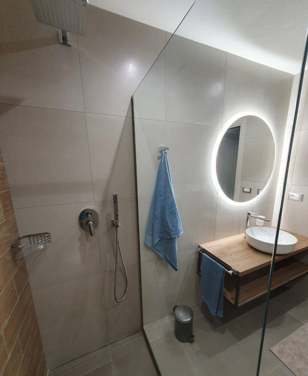 Großes Badezimmer mit begehbarer Glasdusche