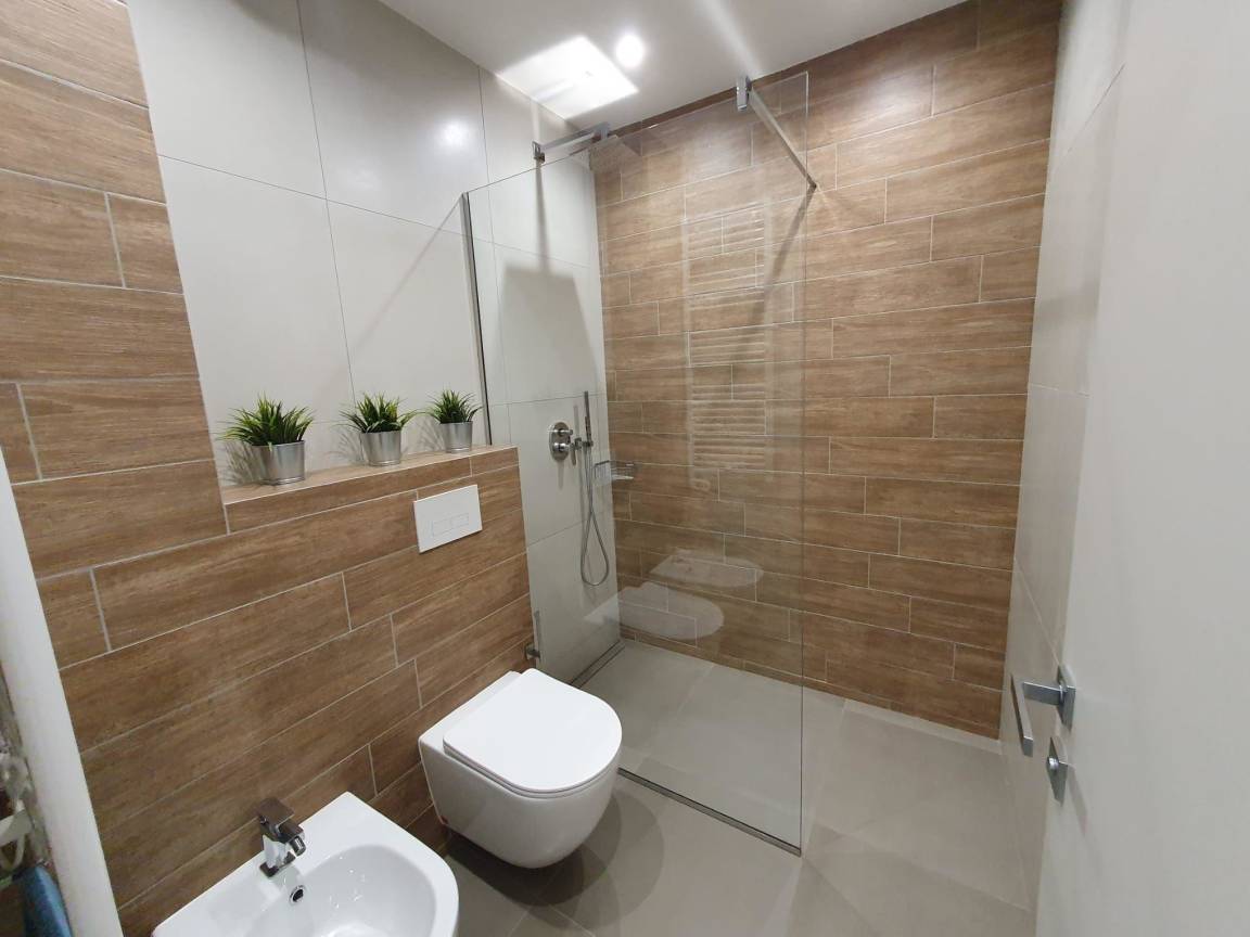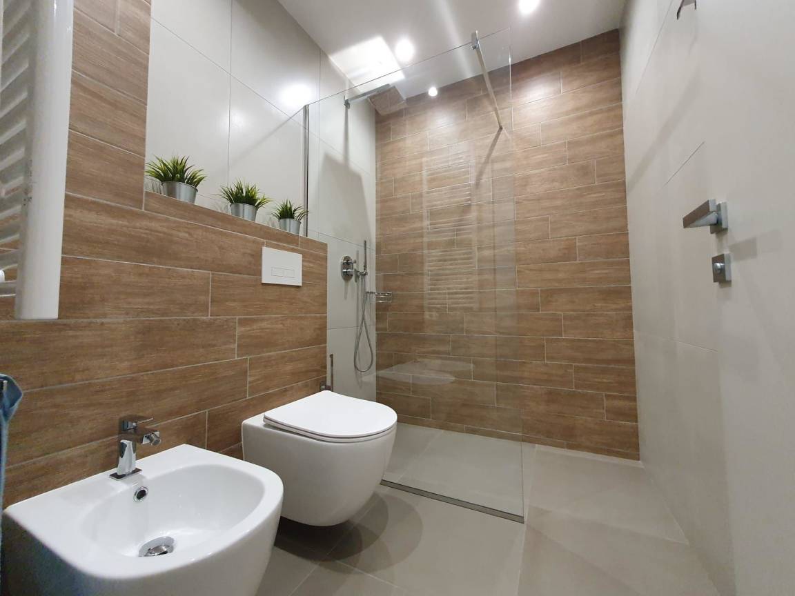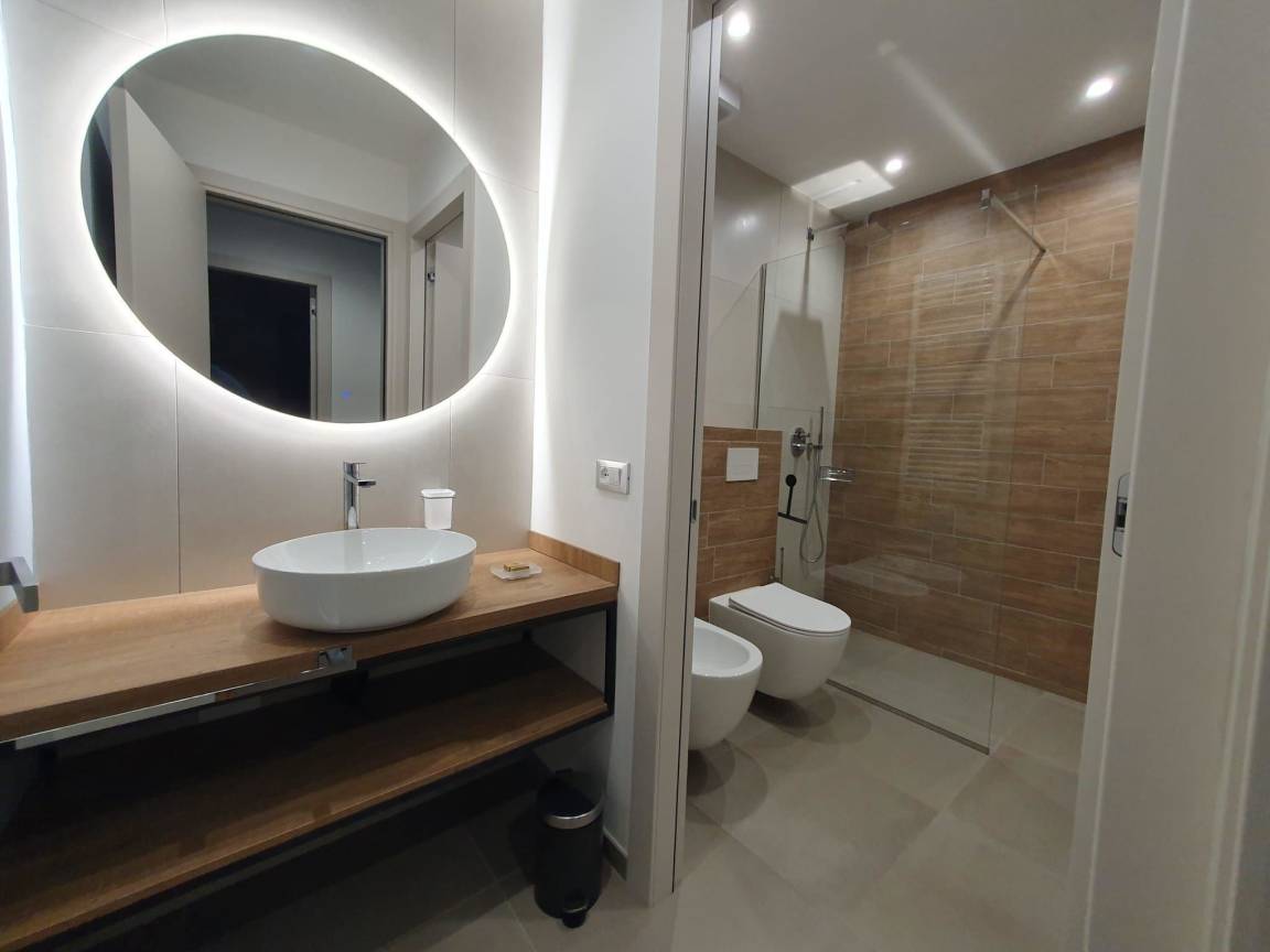 Großes Badezimmer, ausgestattet mit Sanitärkeramik, Walkin Glasdusche und Vorraum mit Waschbecken, heller runder Spiegel.