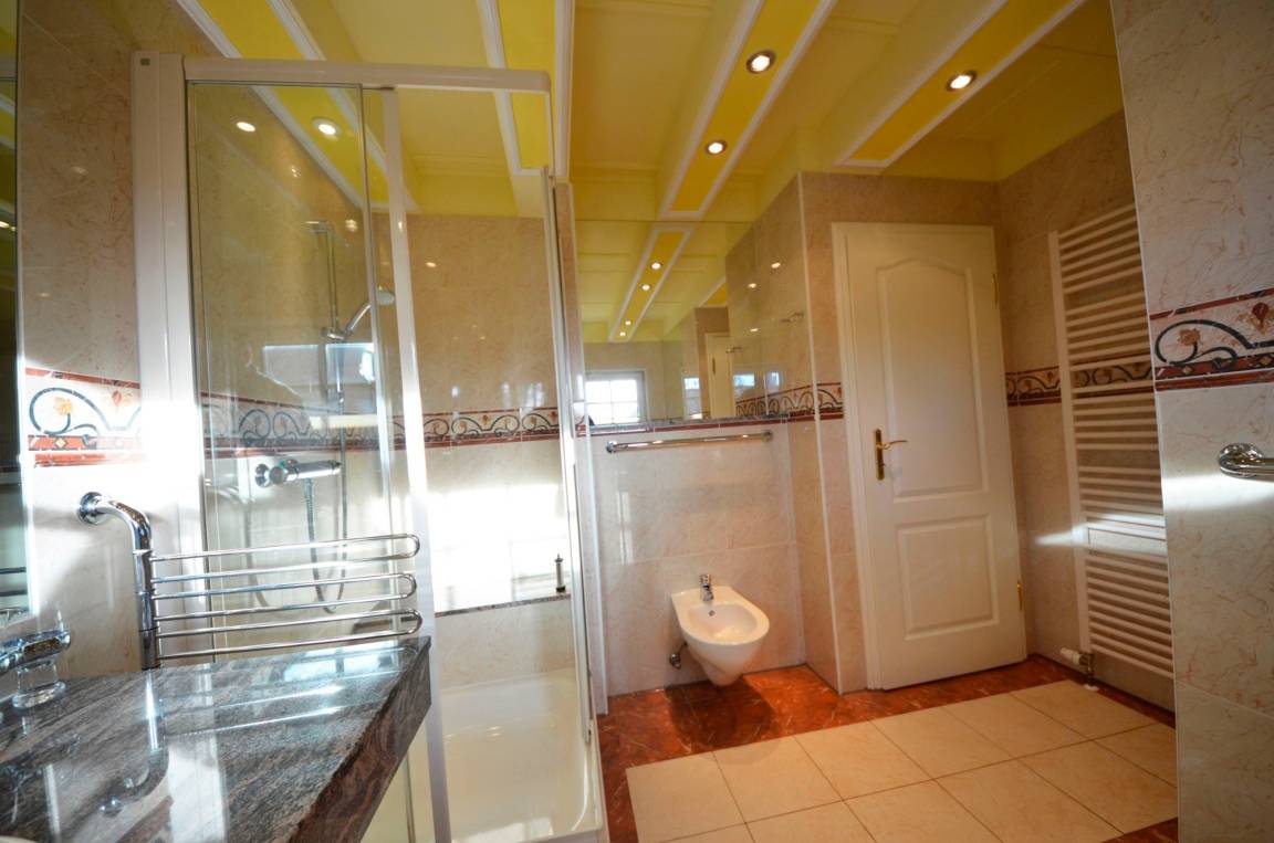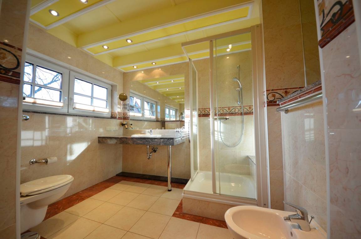 Fußbodenheizung, Naturstein - Abdeckungen, große Spiegel, schöne Sanitärausstattung, Einbau-Waschbecken mit Granit - Abdeckungen, beheizbarer Handtuchhalter, Glas -Dusche mit Sitzmöglichkeit, Bidet, Fön, Schminkspiegel,