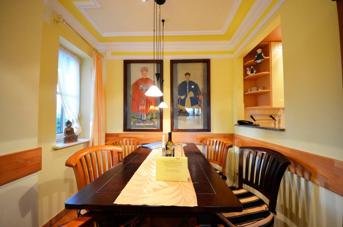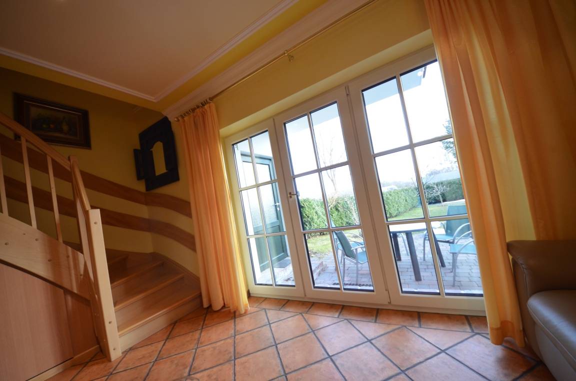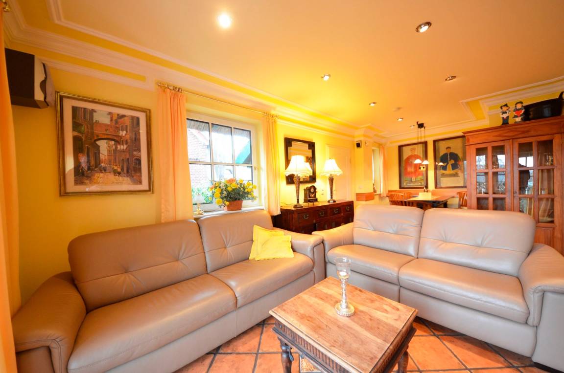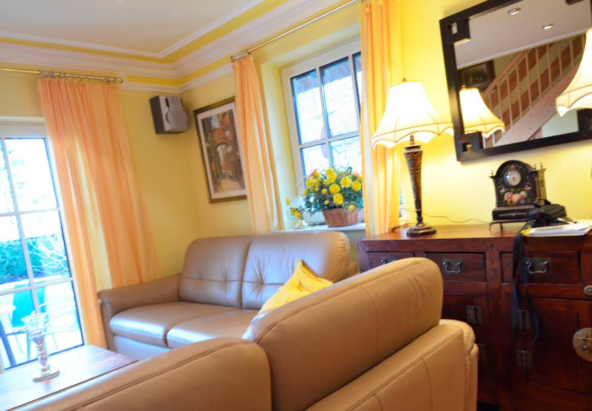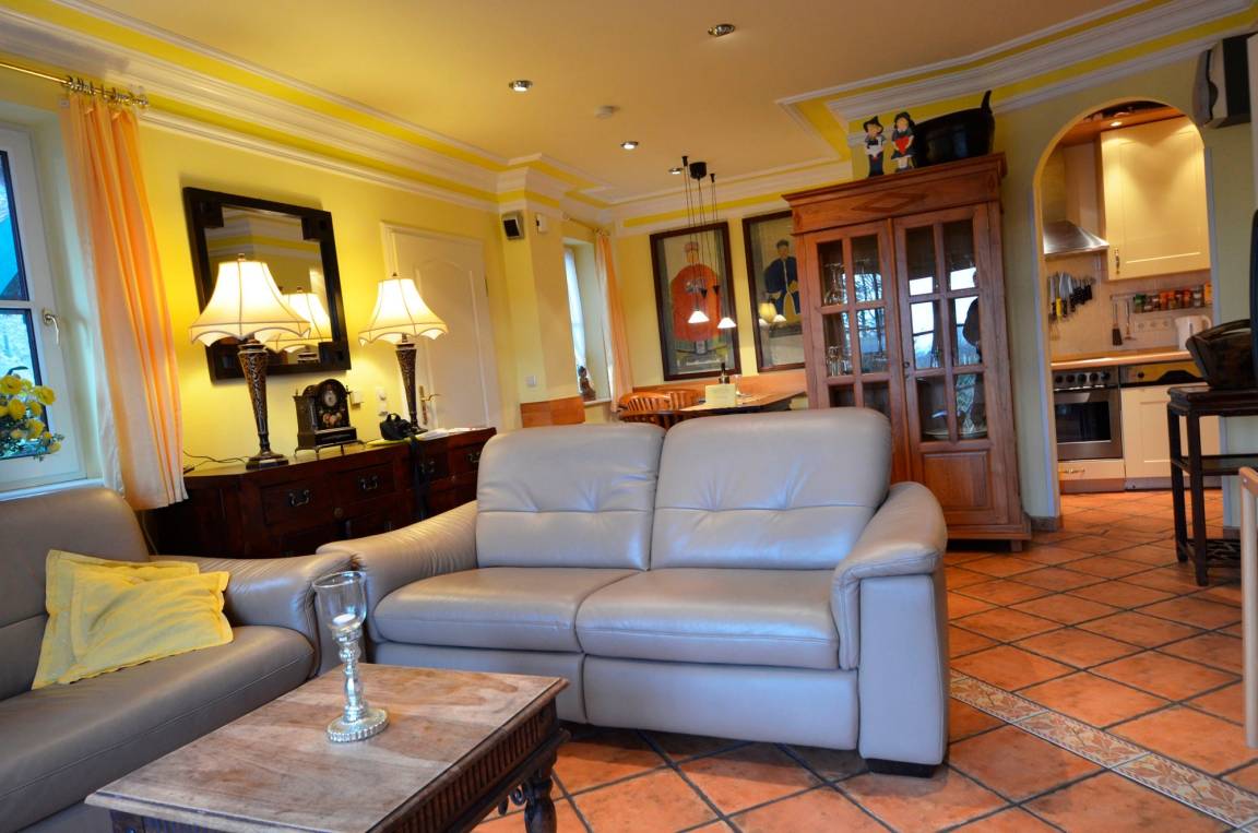 Eingangsflur mit Garderobe und Schuhschrank, Fußbodenheizung, großzügiges Wohn- Esszimmer, schöne Couchgarnitur mit Opiumtisch, Esstisch mit 5 Stühlen, Geschirrschrank, Satt - TV mit 82-106 cm! Großbild mit ca.40 Programmen, Stereoanlage, CD - Player, Telefontisch mit Telefon und balinesischem Spiegel pp.