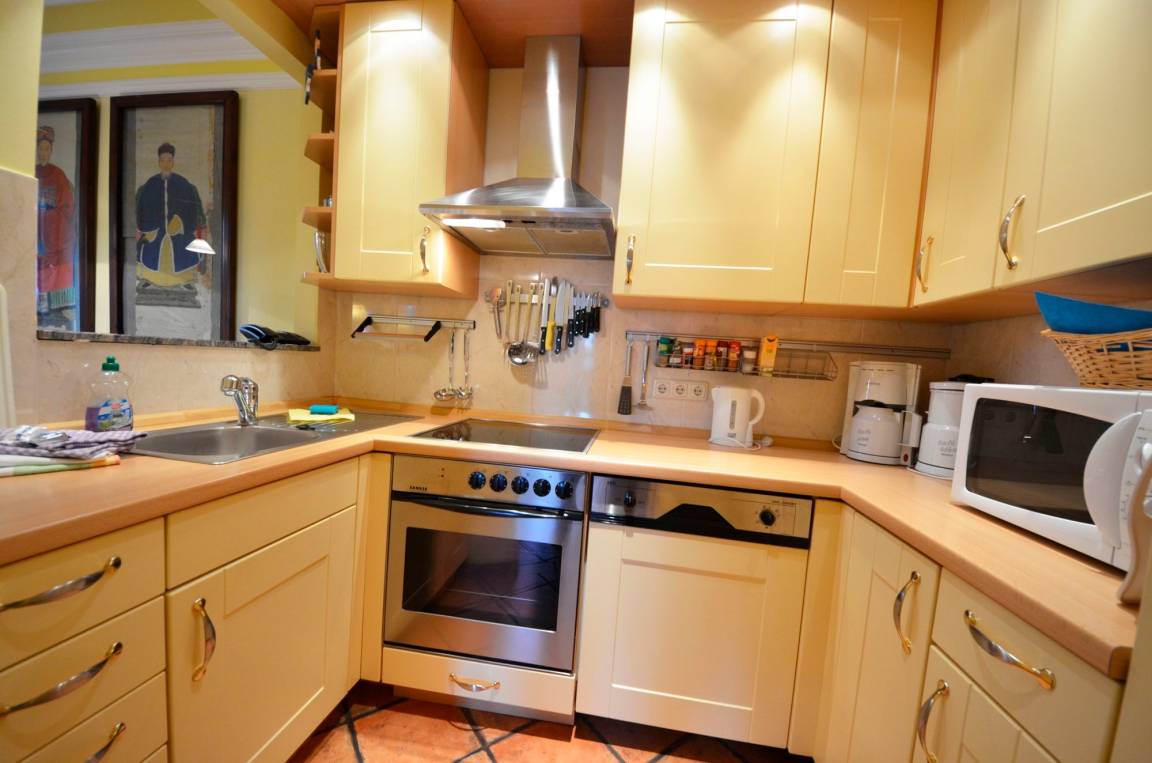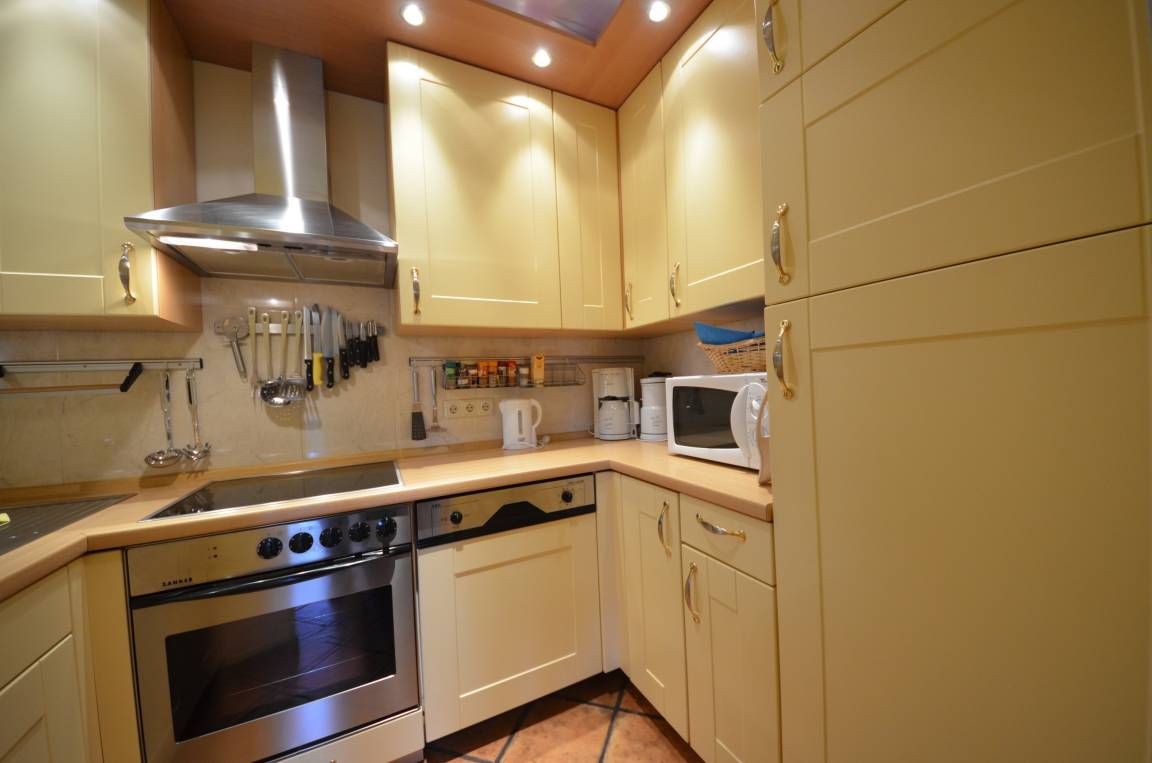 Schöne vanillefarbene Landhaus-Einbauküche, Geschirrspüler, Mikrowelle, Herd mit Ceran - Kochfeld und Backofen, Turmhaube, Kühlschrank mit Gefrierfach, 2 Kaffeemaschinen, Wasserkocher, Eierkocher, Toaster, Waffeleisen, Mixer, Schnellkochtopf, geschmackvolles Geschirr. Teilweise Gewürze und Geschirrtücher.