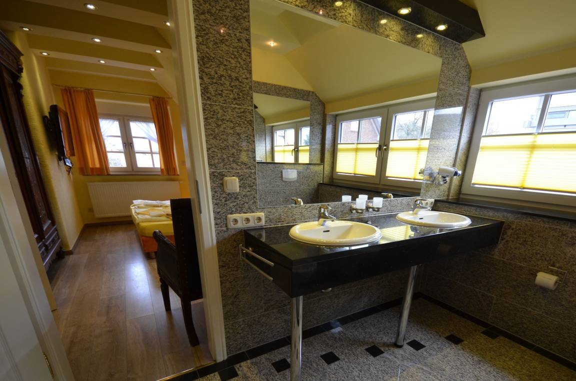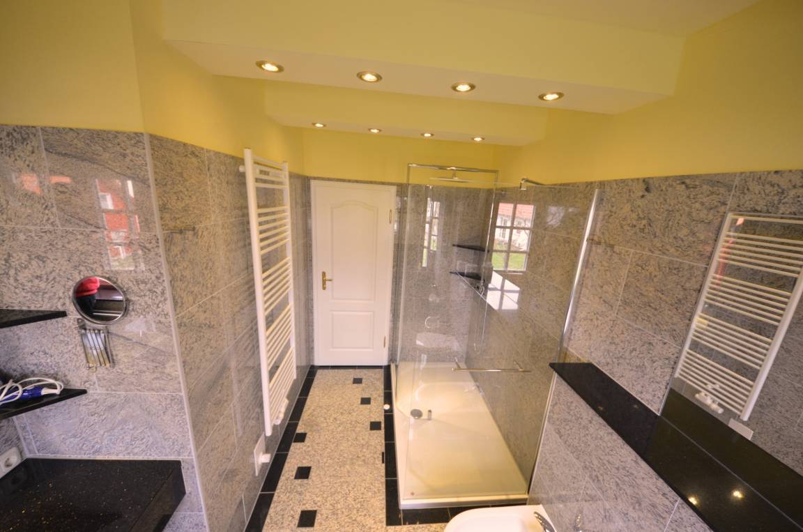 1 Bad im EG, 2 Bäder im OG und 1 Bad im Dachgeschoß. Fußbodenheizung im EG u. OG, Granitabdeckungen und Granitwandverkleidungen. Alle Waschtischabdeckungen aus schwarzem Granit "Star Galaxy". Große Spiegel, 2 Bäder mit walk-in-Duschen 100 x 140 - 160cm und 2 x mit Bidet.